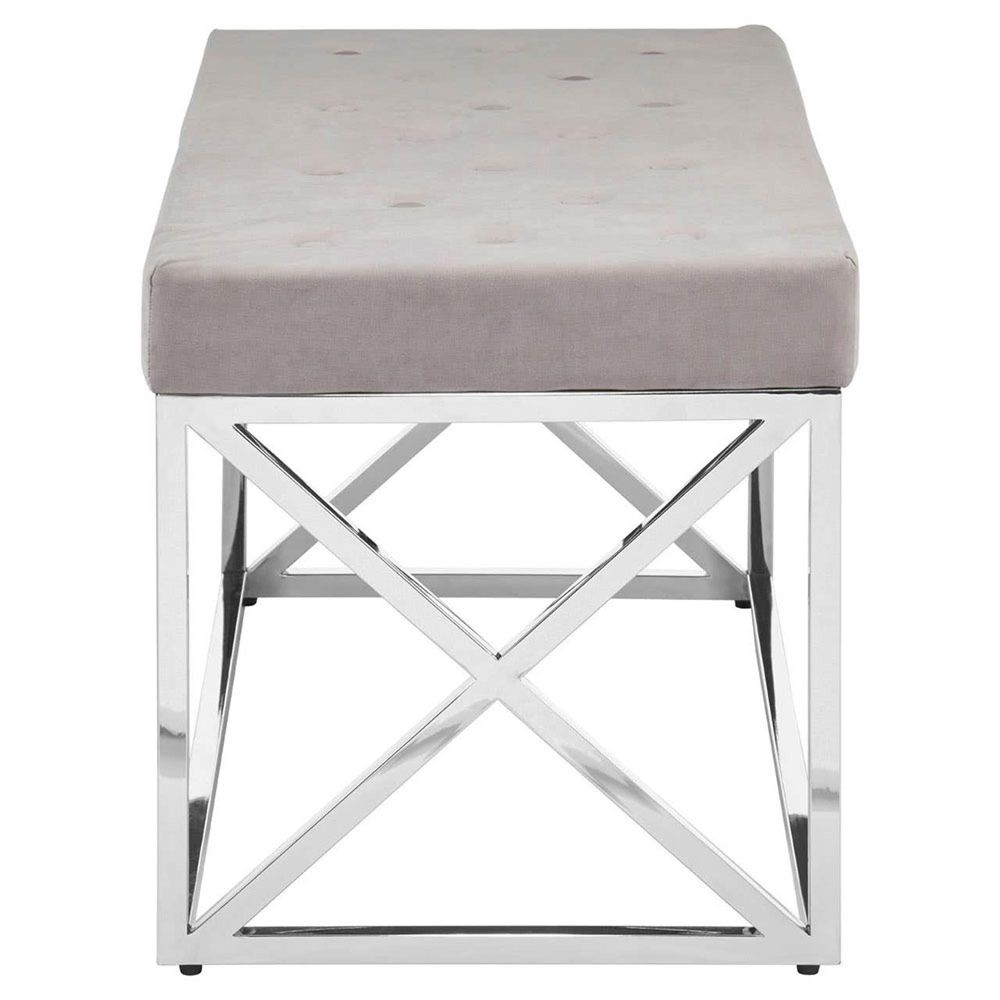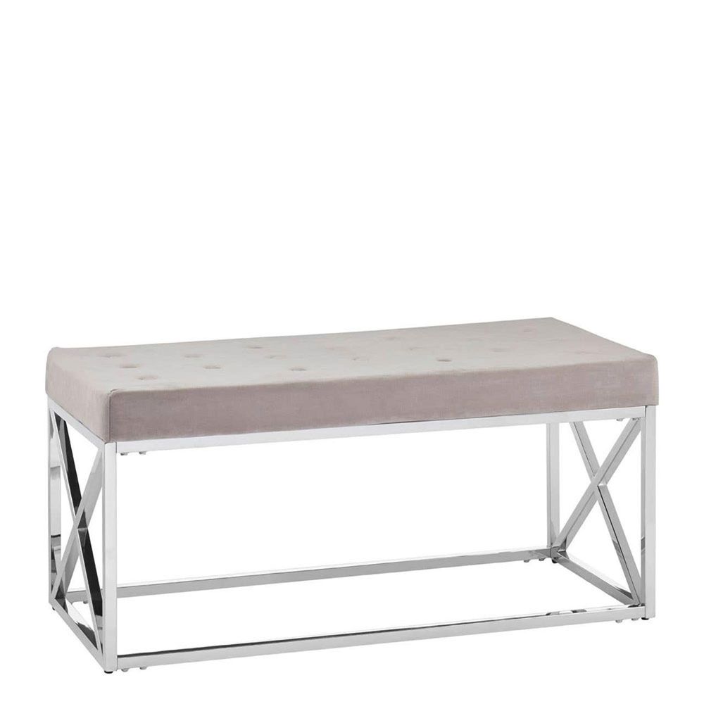 Item Code: 5502618 The Allure Hall Bench is a luxe accent piece designed to complement contemporary interior settings.The base of the Allure Hall Bench features simple angular design lines broken up by the geometric pattern created at each end. Made from smooth stainless steel it boasts a reflective silver finish. The thick cushioned seat is made from soft mink-toned Velvet Fabric creating a tactile counterpoint to the sleek steel. Coordinate with metallic tones.