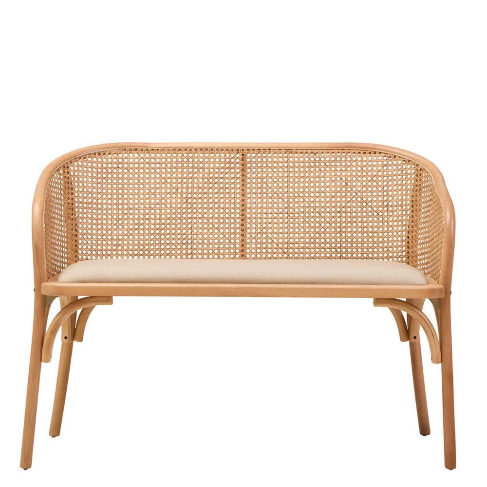 Item Code: 5529703 The Cebu natural cane bench features a curved backrest and a solid beechwood frame, offering stylish seating.This contemporary bench has a curved beech wood frame complemented by a cane woven backrest and a beige padded seat. Fusing comfort with artisanal design, this bench serves as an ideal addition to dining areas and entryways or as a striking statement piece in modern interiors.