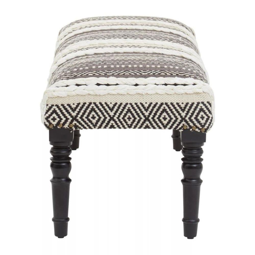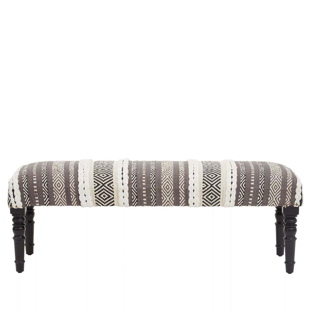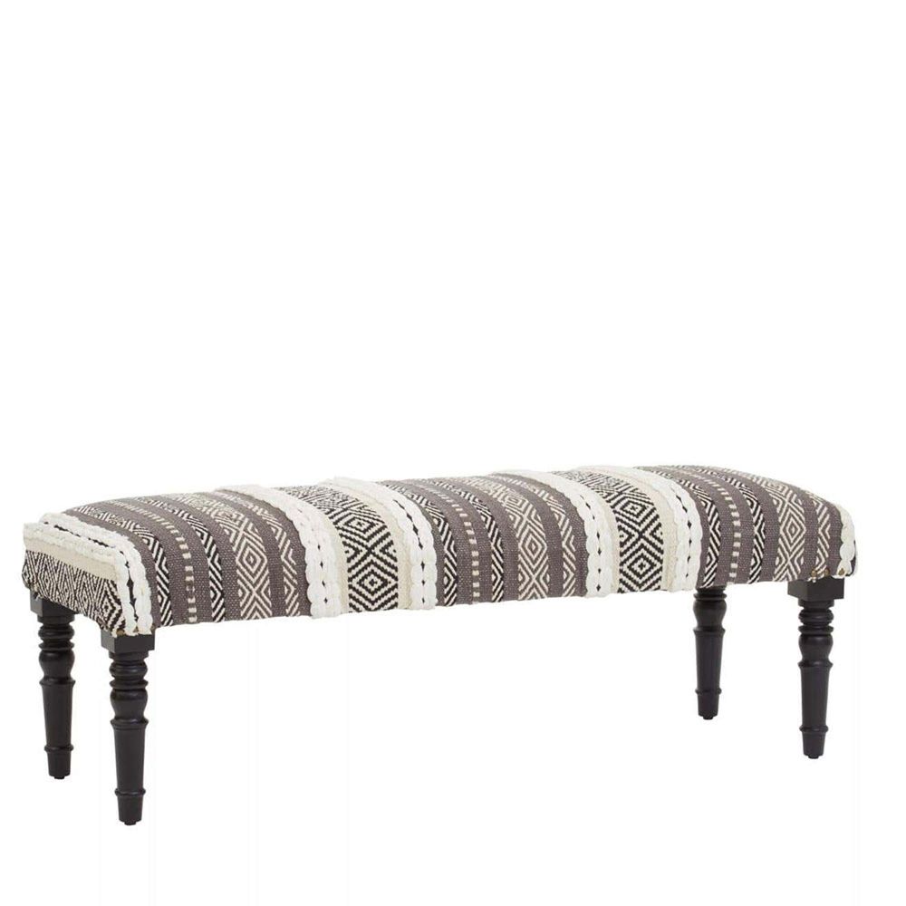 Item Code: 5529589 The Cefena grey and white textured Moroccan bench is supported by sturdy mango wood legs.With its strong and sturdy wooden frame, this bench gives a boho touch to any space. The top of the bench is well cushioned, providing comfort, while the grey and white relaxed fabric provide style.