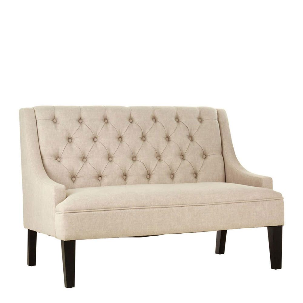 Item Code: 5501815 The linen upholstery of the backrest has been button tufted, while the seat's hem has piped detailing, adding a decorative touch.Traditional in design this gently sloping armrests and a high rectangular back both contribute to the bench's classical style. The bench's four smooth legs are created from black rubberwood, offering a striking counterpoint to the light hue of the linen upholstery.