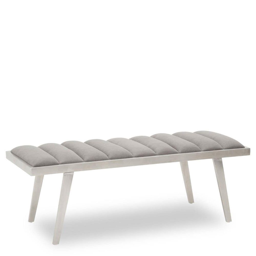 Item Code: 5528209 This bench has a soft and sumptuous cushioned seat supported by silver finish splayed legs that blend with a modern and comfortable touch.Covered in plush grey velvet, this bench offers comfortable seating with a deep channel tufted seat in a decorative texture. The seat in sumptuous padding rests on brushed silver splayed legs.
