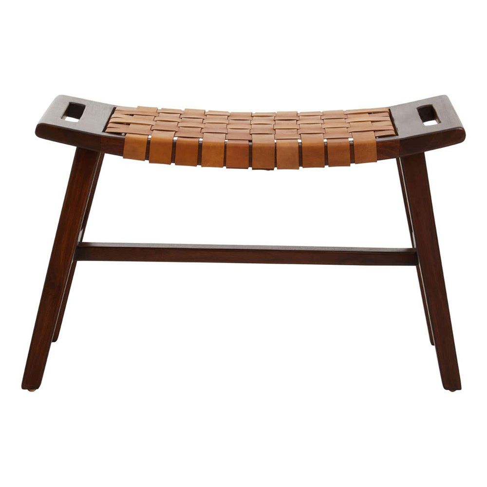 Item Code: 5528956 The Inca stool has a tan leather seat featuring a basket weave design with solid teak wood tapered legs.This stool has a rectangular seat made from hand woven tan leather straps which intersect each other to form a lattice. The mid century look is complete by a solid teak wood frame accented in a warm and natural finish.