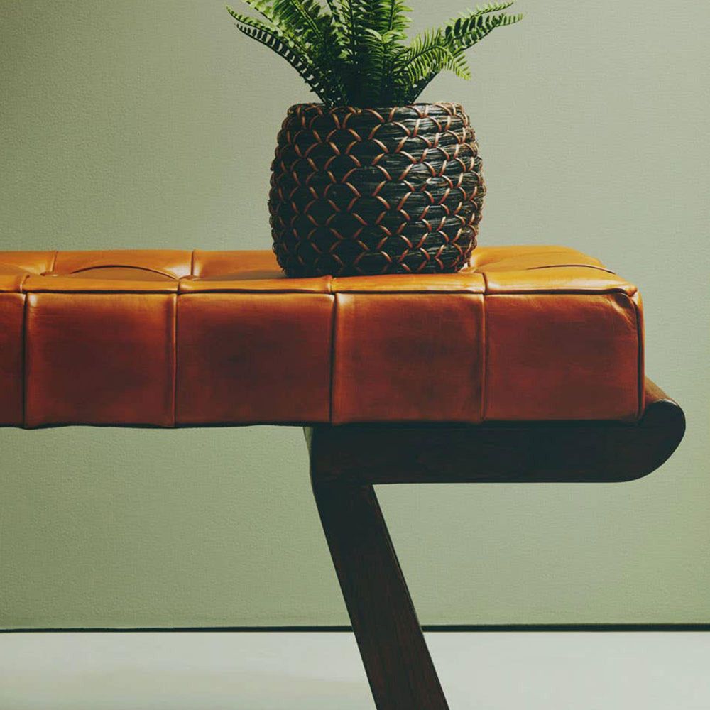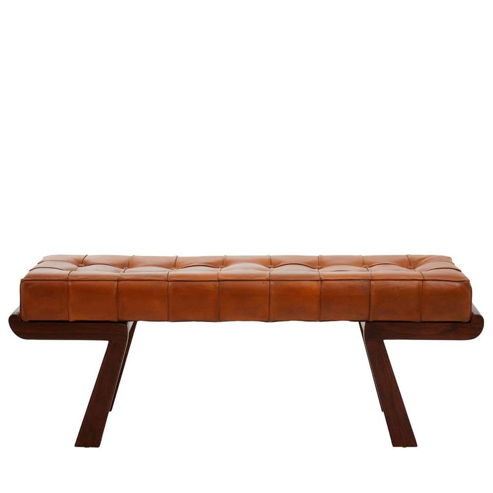 Item Code: 5528960 The Inca bench has a brown genuine leather tufted seat supported by an angular cedar wood base.This bench has a button tufted seat upholstered in brown genuine leather. The rectangular seat in dense form padding matches the smooth warm brown cedar wood frame forming an elegant angular base.