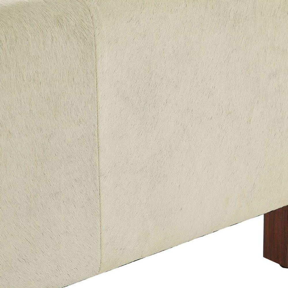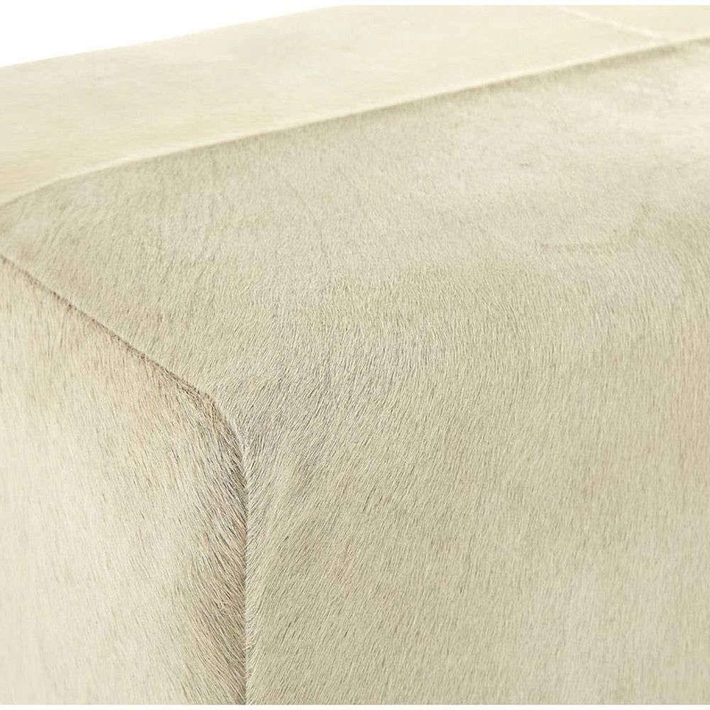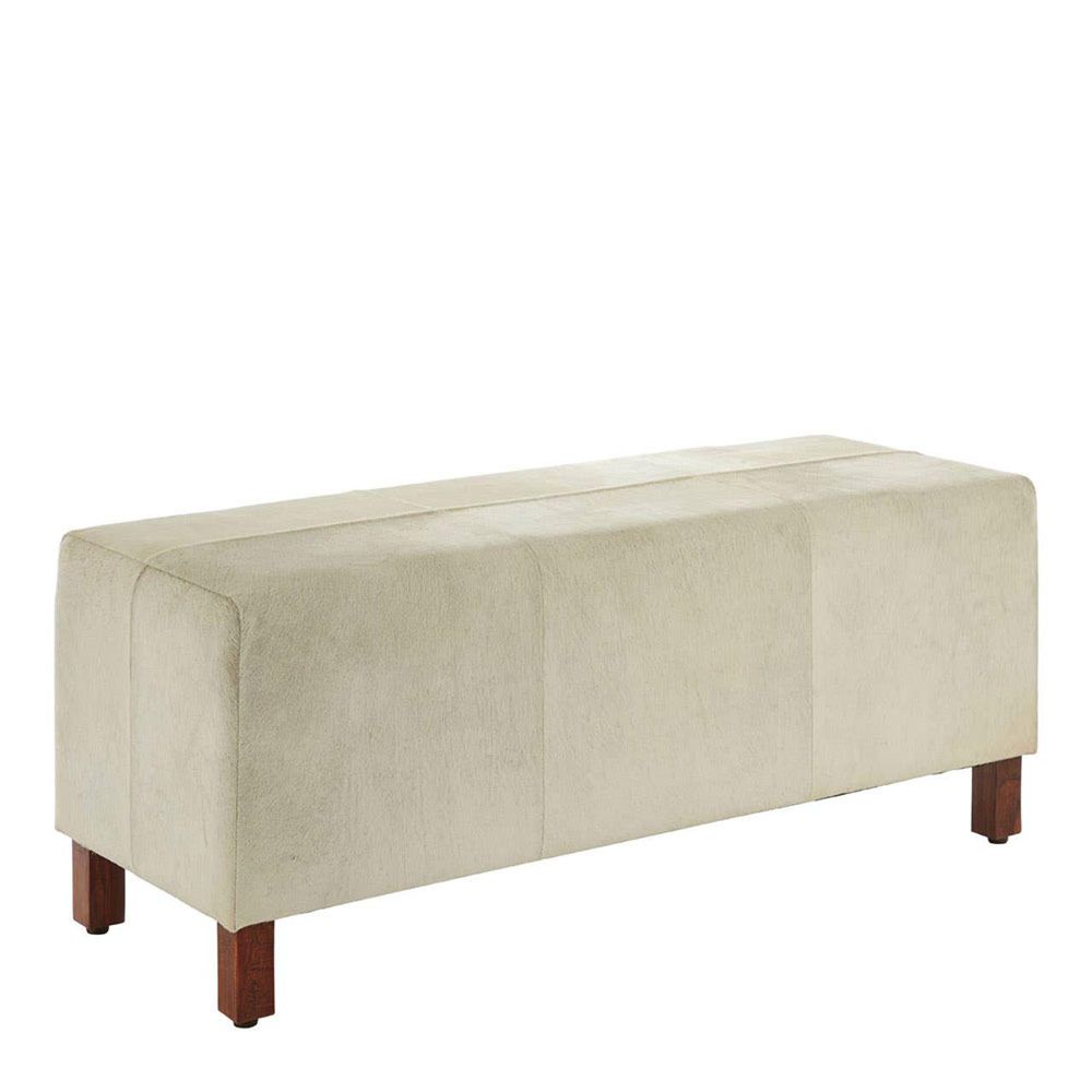 Item Code: 5501749 Incorporate a stylish textured accent with the Kensington Townhouse bench featuring genuine leather upholstery and natural wooden legs.The rectangular bench stands on four short legs crafted from real wood. Their dark colour and prominent grain counterpoint the clean white colour of the genuine leather above. The cowhide leather retains its hair for a more tactile finish. Stitching intersects the leather's surface to produce a panelled effect on the top and sides.