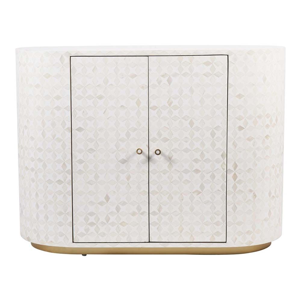 Item Code: 706211 The Aspen Bone Inlay Two-Door Bar Cabinet is a striking cabinet that commands attention with its elegant curved edges. The two doors are beautifully encased in a stunning bone inlay design. Resting on a subtle antique brass plinth, this cabinet offers a refined yet practical storage solution. The piece seamlessly blends timeless artistry with modern functionality, making it a standout addition to any interior. As part of the Aspen collection, it pairs perfectly with the Aspen Bone Inlay Sideboard and Round Mirror, creating a cohesive and breathtaking collection.