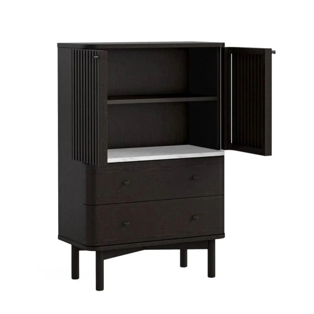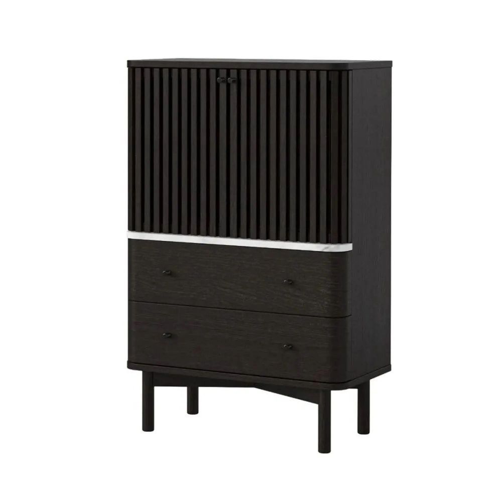 The black finish highlights the smooth grain of the wood, while the slatted doors add subtle texture and visual interest. Behind the two slatted doors are adjustable shelves, including an internal white marble shelf — a signature detail that reflects sophistication and attention to craftsmanship. Stylish black knobs complete the look, balancing simplicity with understated elegance.