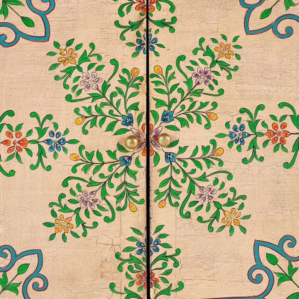 Item Code: 1143 2 DOOR FURNITURE IN MANGO WOOD, HAND PAINTED DETAILS. DOOR MEASUREMENT: 54 X 25CM. INTERIOR SHELF HEIGHT: 27CM. LEGS HEIGHT: 11CM