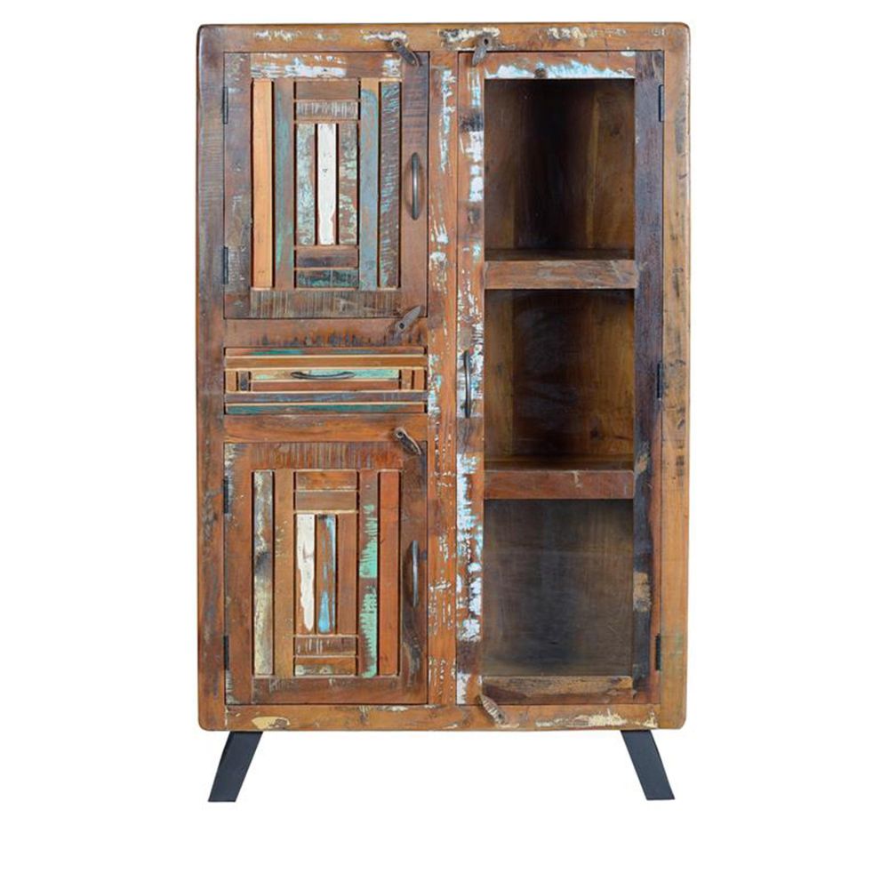 Item Code: 6982 RECYCLED WOOD CUPBOARD WITH 3 DOORS AND 1 DRAWER IN RECYCLED WOOD WITH METAL LEGS AND HANDLES.