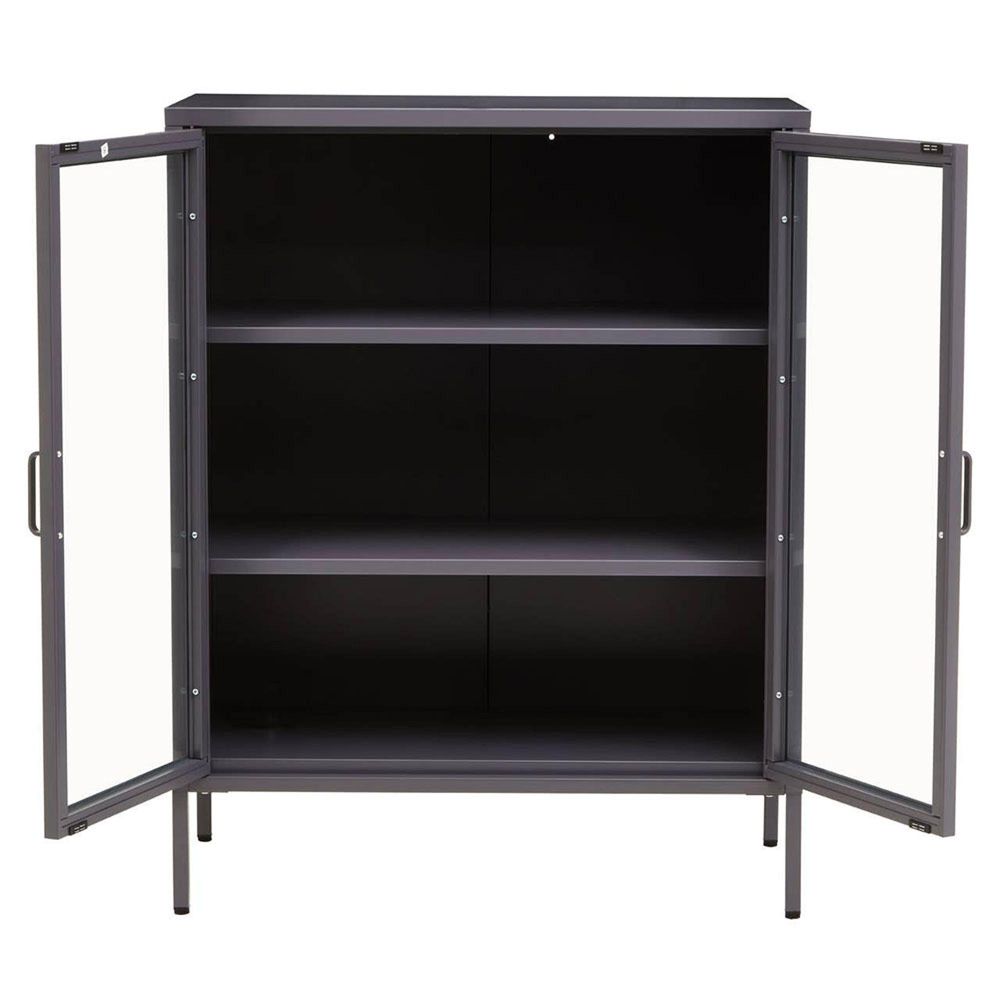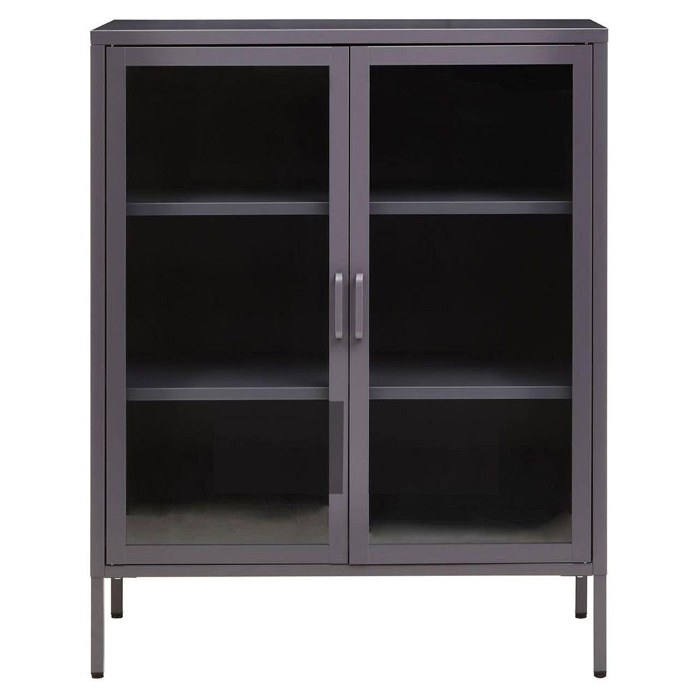 Item Code: 2406591 The Acier two door grey metal cabinet with compartments keeps books, magazines or DVDs organised and easy to access.Featuring an elegant and classic design, this cabinet ensures lasting use with sturdy metal construction in grey powder coating. Two glass doors with metal handles reveal adjustable inner shelves, providing ample space for compact storage.