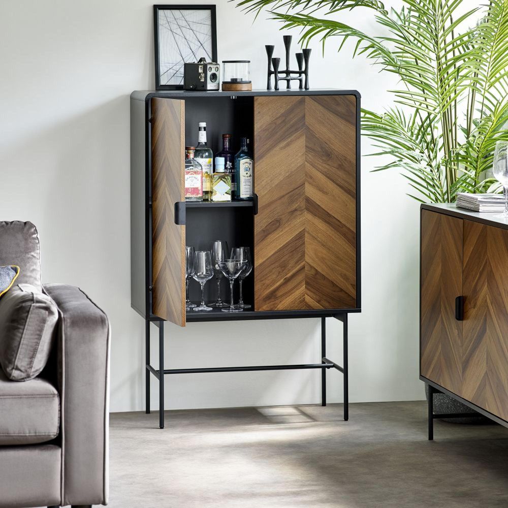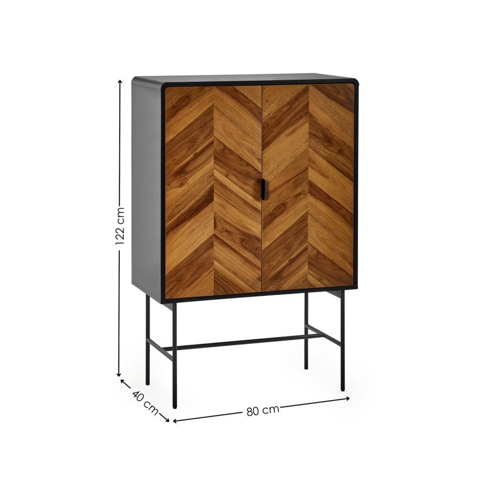 Item Code: ALV002 Add a stylish touch to your home with this contemporary storage cabinet that perfectly blends design and function. Featuring bold chevron wood-effect doors framed by smooth black edges and sleek black edge handles, it brings subtle texture and refined detail to your space. Gently curved edges give it a softer, modern look. Behind the two doors, a fixed shelf offers plenty of room to organise books, dining essentials, or everyday items with ease. Supported by slim black metal legs, it delivers a lightweight feel that complements both modern and industrial interiors. Ideal for living rooms or dining areas. Self-assembly required.