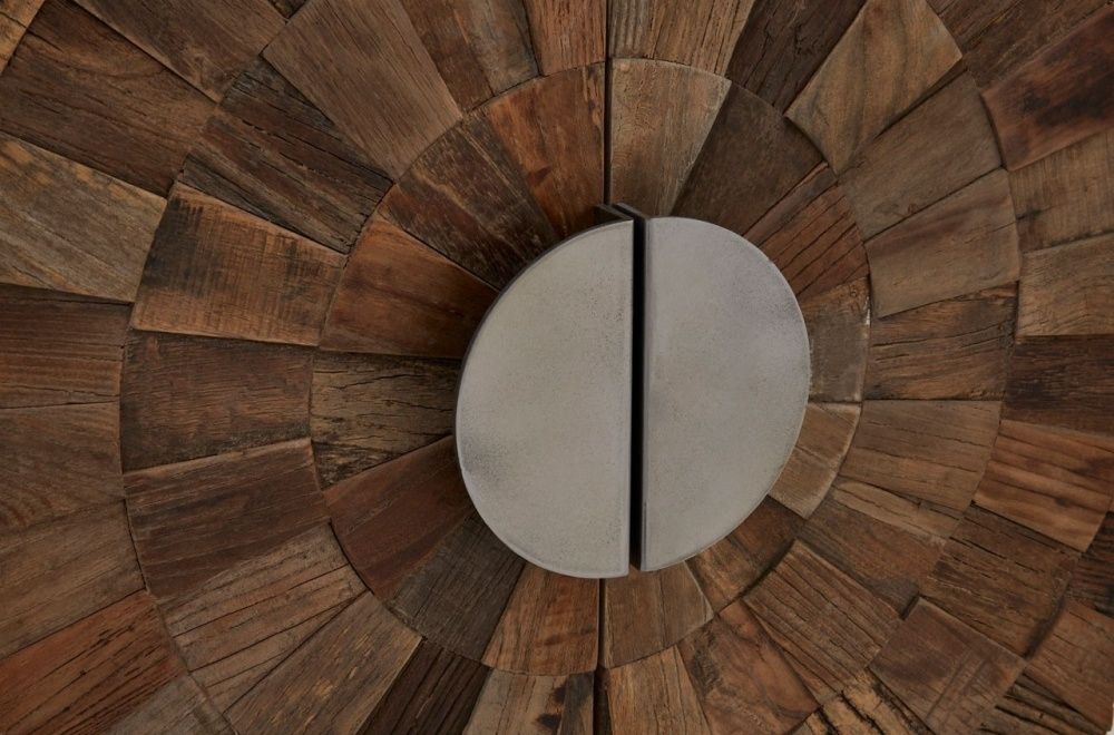 Item Code: 5502402 This boho inspired cabinet creates a concentric pattern with individual tiles of natural elm wood.The Midas cabinet is supported by a minimal iron frame, coloured silver to complement the semi-circular handle that adorns each door. When the doors are closed the handles form a full circle that complements the surrounding textured pattern. The differently coloured strips of elm wood enhance the cabinet's visual appeal.