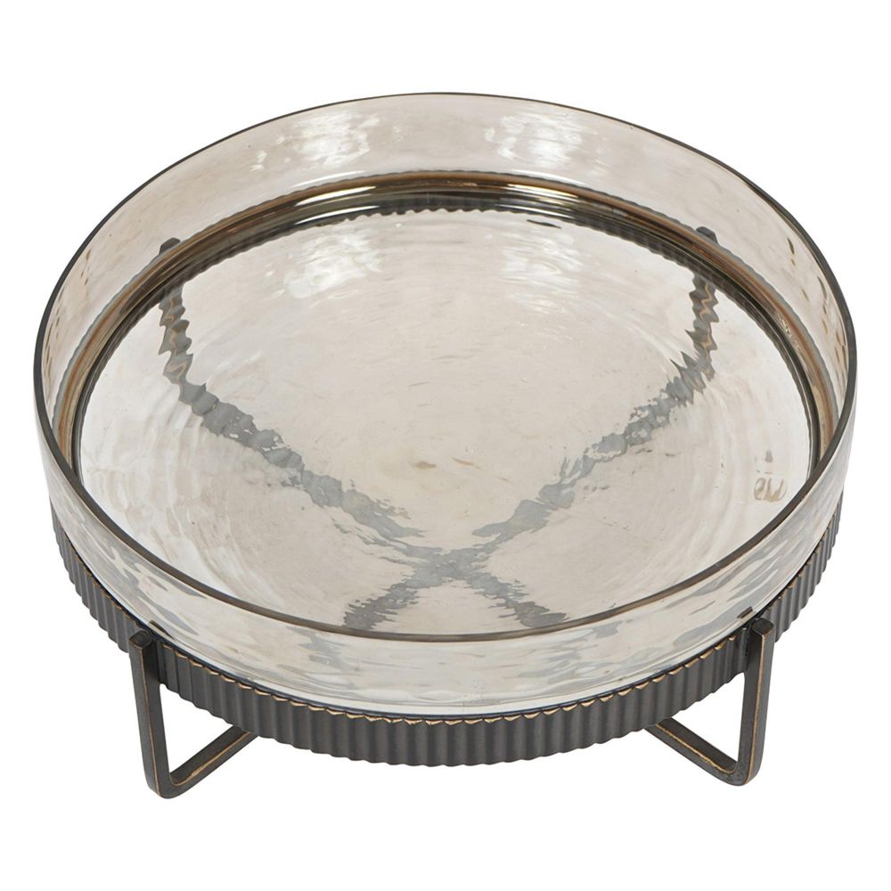 Item Code: 706600 Defined by its raw material contrasts and sculptural form, the Beresford Platter On Stand features a wide, round surface in hammered glass, rich with texture and soft bronze tones. Framed in ribbed iron and raised on an intersecting metal base, it makes a refined serving plate for snacks, fruit or treats.Free Delivery