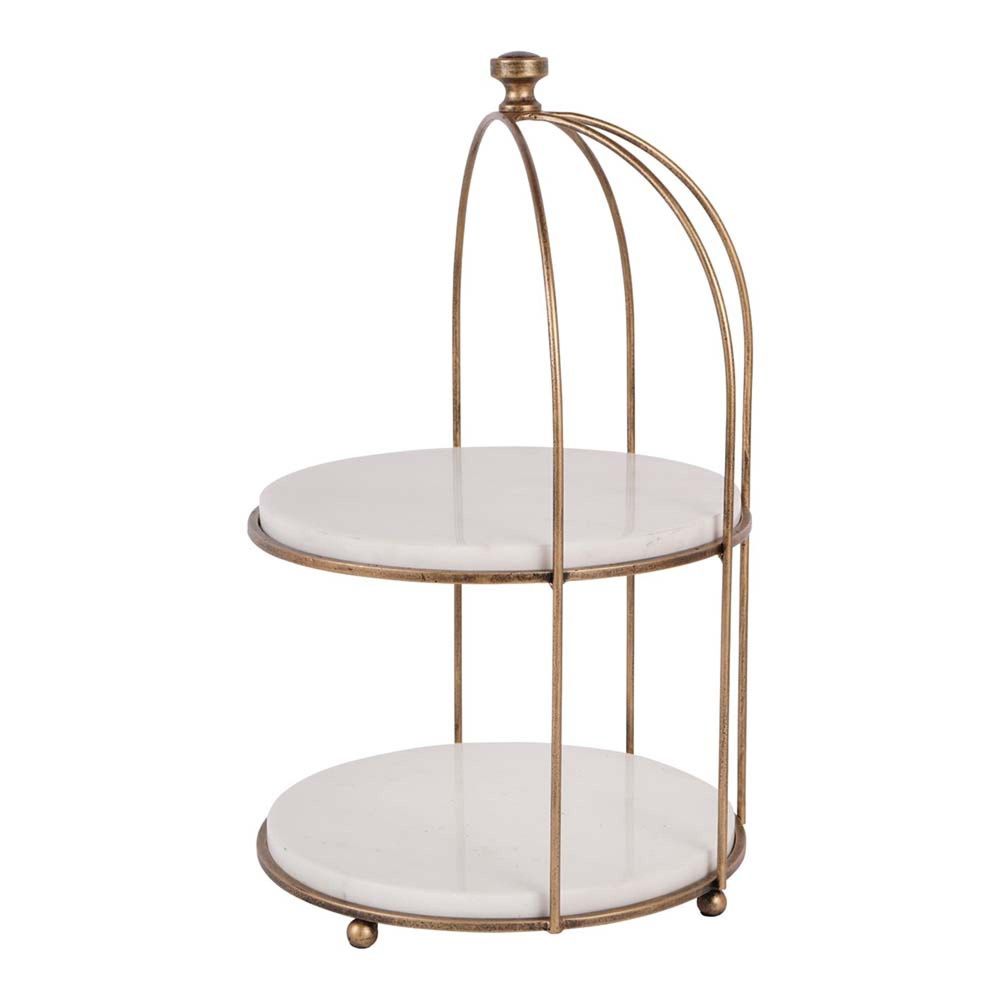 Item Code: 706184 The Belvedere Aged Gold Two-Tier Buffet Stand makes a striking statement piece in both traditional and modern interiors. Designed with two tiers to hold a variety of items, from food to decor, the two-tier design provides ample space for a stylish and functional display. The rich aged gold metal frame and White Banswara marble are a sophisticated combination. A single-tier, two tier and multi-tier circular buffet stand are all available as part of the Belvedere collection.
