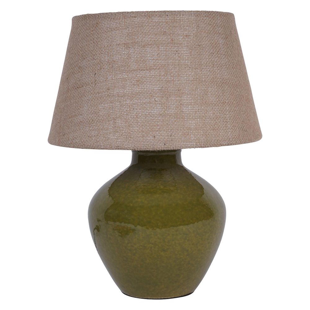 The Aubrey Lamp in Green features a beautifully glazed ceramic base in a rich, mossy tone, paired with a natural hessian shade for a soft, organic look. Its subtle mottled finish adds depth and texture, making it a versatile piece for both modern and rustic interiors. Ideal for bedside tables or compact surfaces, this smaller version is also available alongside a larger size in the same style. 30 x 30 x 41 cm.Bulb Type: E27. Max Wattage: 60W. Switch Type: Standard Toggle Switch.Both sizes also available in Terracotta, with Dusky Pink offered in the small only.Free Delivery