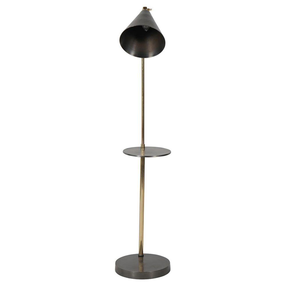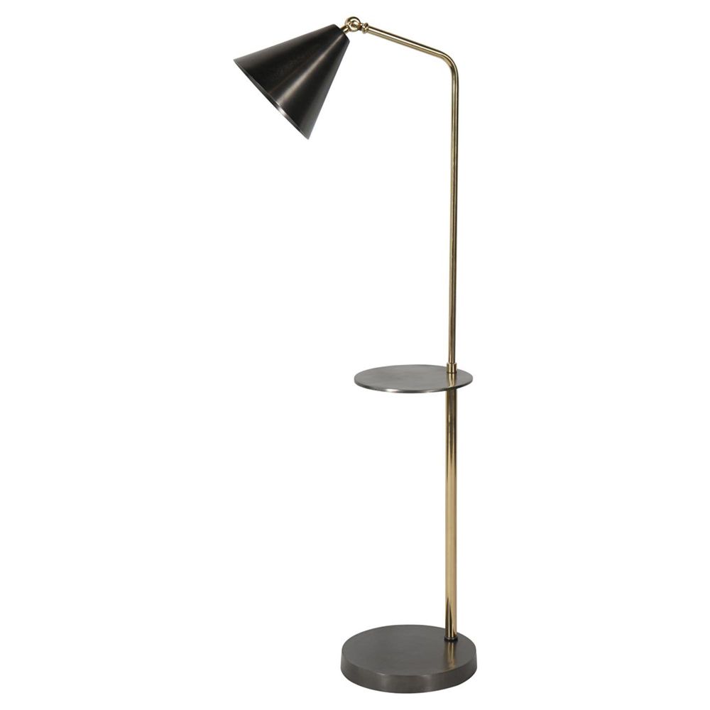 Item Code: 704833 Our contemporary Amelie Floor Lamp combines function and style. Perfect beside a reading chair or sofa, this striking lamp features a Brushed Satin Grey direction-adjustable lampshade, sturdy base, and pedestal table. The vertical support stand and fixings are in a contrasting brass coloured finish. This floor lamp is supplied with a 180cm black cable with a convenient inline rocker switch. The base measures 29cm diameter, and the pedestal table diameter is 25cm.Free Delivery