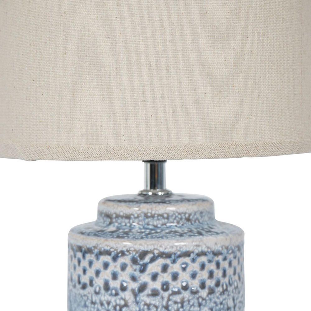 Item Code: 704861 Our Stormy Sky Table Lamp is made in ceramic. The urn shaped lamp base has a dimpled texture of differing intensities, which itself is then topped with a beautiful reactive glaze in tones of blues, whites and taupe's, reminiscent of stormy skies. The glazing technique ensures each and every piece is unique. Comes complete with a circular drum lamp shade in a natural unbleached linen finish. This table lamp stands 40cm tall, benefits from a 120cm black cable with an inline rocker switch. Requires 1x E14 Bulb, not included.Free Delivery