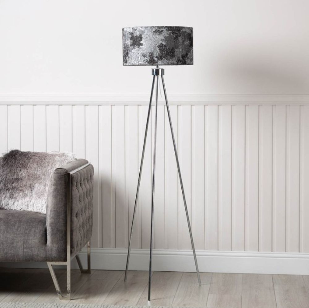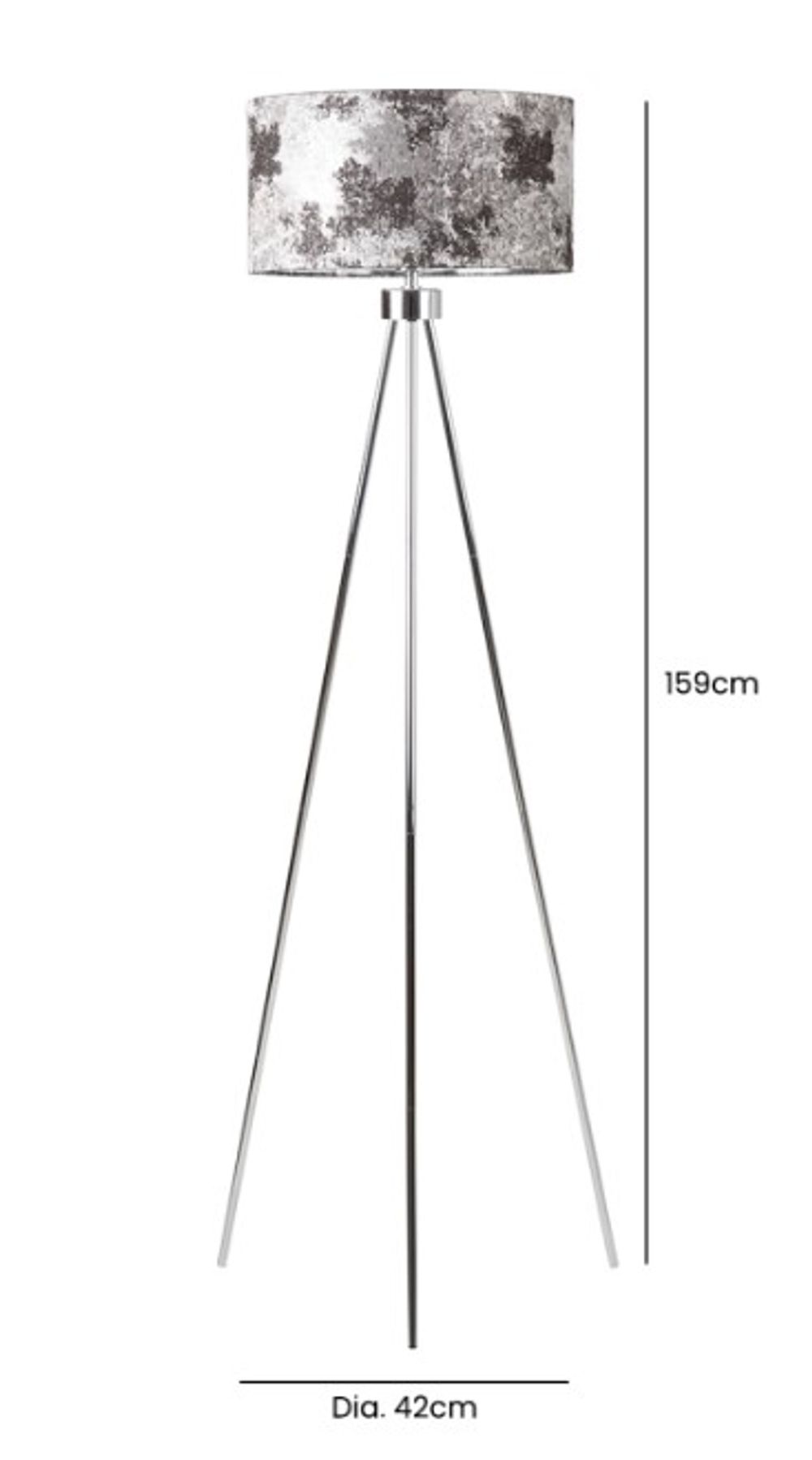 Item Code: EU-BT640-L0-CYL-BLSV Standing elegantly on three Chrome legs that are bound together with a metallic ring, this tripod lamp is sophisticated and slender. With the addition of the chic black and white linen lampshade lined in silver, this will provide a versatile and modern lighting feature in your home. All you have to do is plug it in where you want it and you're done. Also available in 63cm table lamp version for classy co-ordination.