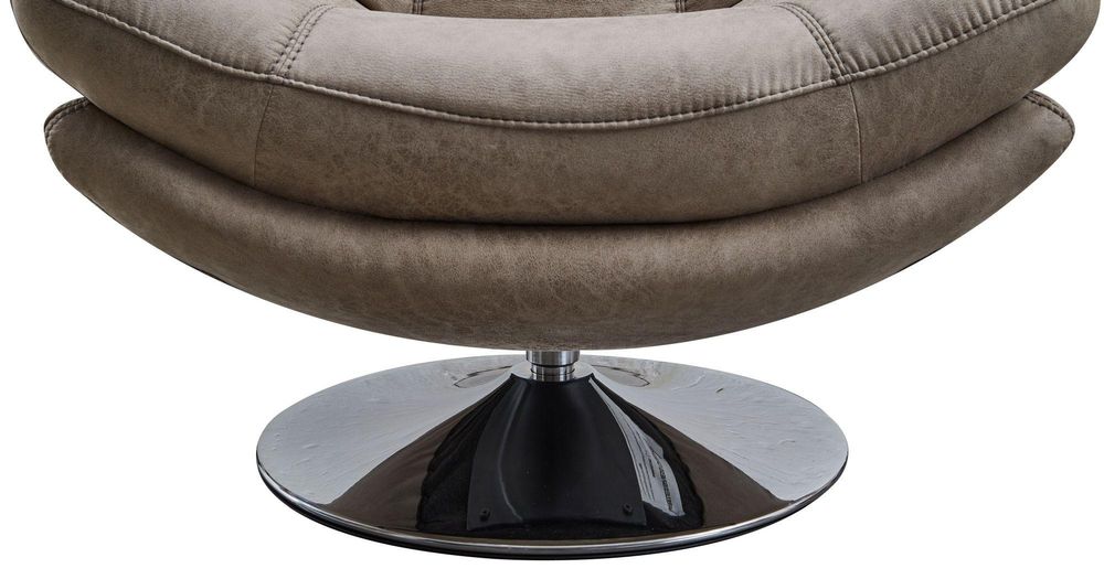 The smooth 360-degree swivel function allows for flexibility and ease of use, while the generously padded seat and back offer lasting support whether you're enjoying a quiet evening or hosting guests. The matching footstool, featuring the same upholstery and polished chrome legs, completes the set with cohesive elegance.