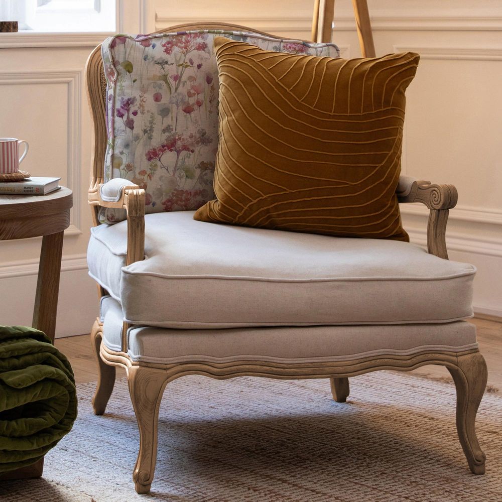 Voyage Maison Oak/Poppy Pink Ilinizas Printed Florence Chair. Floral. Cotton Blend. Country. Digitally Printed. Wood. Frame: 100% Oak Wood, Outer Chair Cover: Cotton 80%, Linen 20%, Inner Chair Cover: 85% Polyester, 15% Cotton. Featuring a watercolour study of elegant meadow flowers. A classic and timeless design, perfect for any country-inspired home. Made of solid oak wood, providing durability, warmth and elegance to your home. Includes removable cushions, ideal for easy cleaning and maintenance. Digitally printed to perfectly capture the design as intended by our in-house artists. Oak Wood. Digitally Printed. Durable. Introducing the Ilinizas Florence Chair, where elegance meets nature in perfect harmony. This exquisite piece showcases intricate French-style carvings that elegantly adorn its solid oak frame, exuding timeless charm and durability. This exquisite chair blends classic sophistication with modern comfort, featuring removable cushions adorned with luxurious cotton linen covers. Immerse yourself in the serene beauty of its design, featuring a watercolour study of elegant meadow flowers. This unique blend of artistry and craftsmanship makes the Florence Chair a stunning addition, instantly elevating the sophistication and allure of any room. Relaxed.