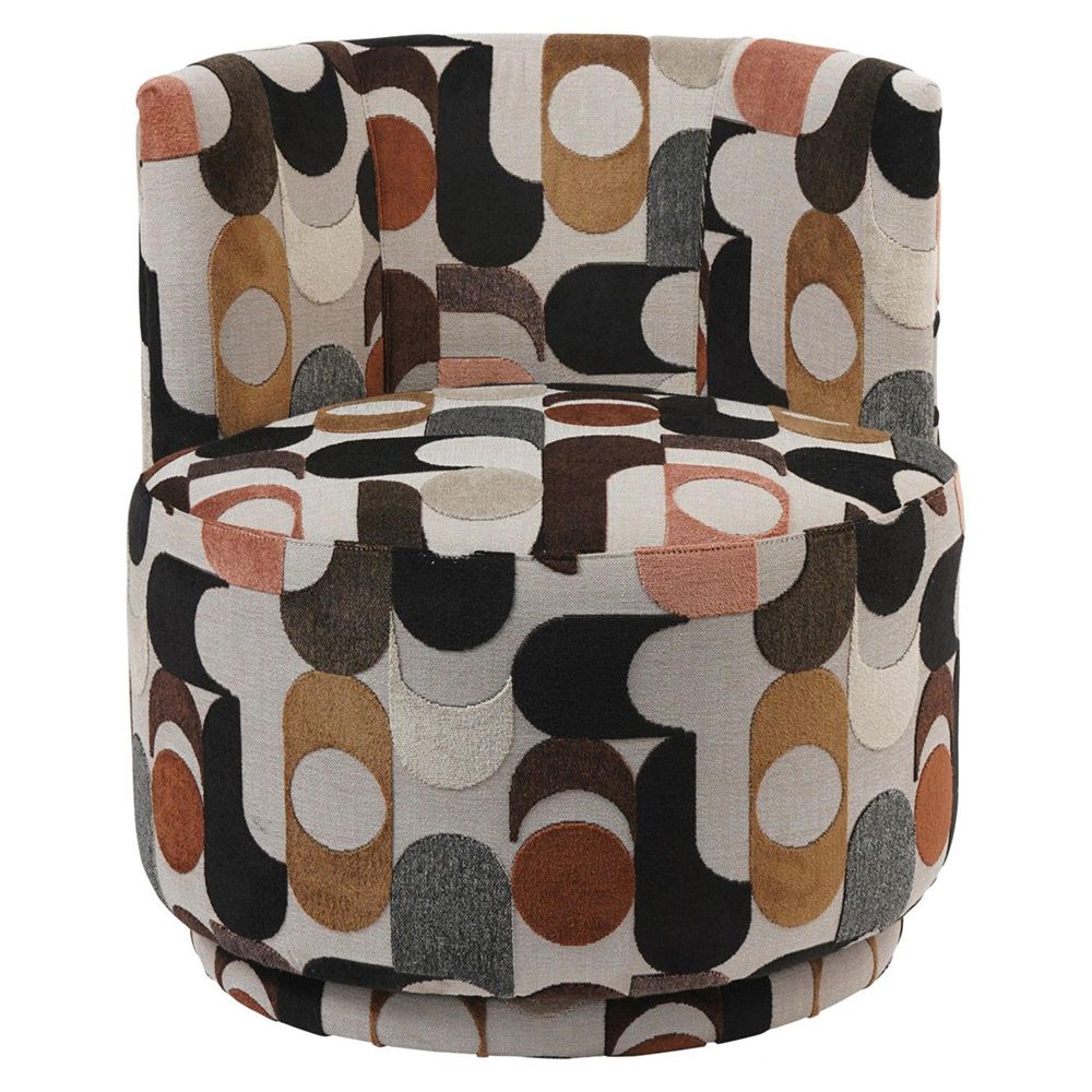 Item Code: 706462 Expressive and compact, the Portico Swivel Chair brings sculptural style and playful geometry to modern interiors. Upholstered in an exclusive, trendy Belgian slub velvet, its retro-inspired pattern mixes warm neutrals with ochre, blush, and espresso tones for a rich of the moment style. The low curved back and generously cushioned seat offer superb comfort, while the hidden swivel base allows for effortless movement. Whether styled as a pair or standing solo, Portico is a bold accent piece with standout personality and refined craftsmanship. 63.5 x 63 x 68.5cm. Seat Height 43cm.Free Delivery