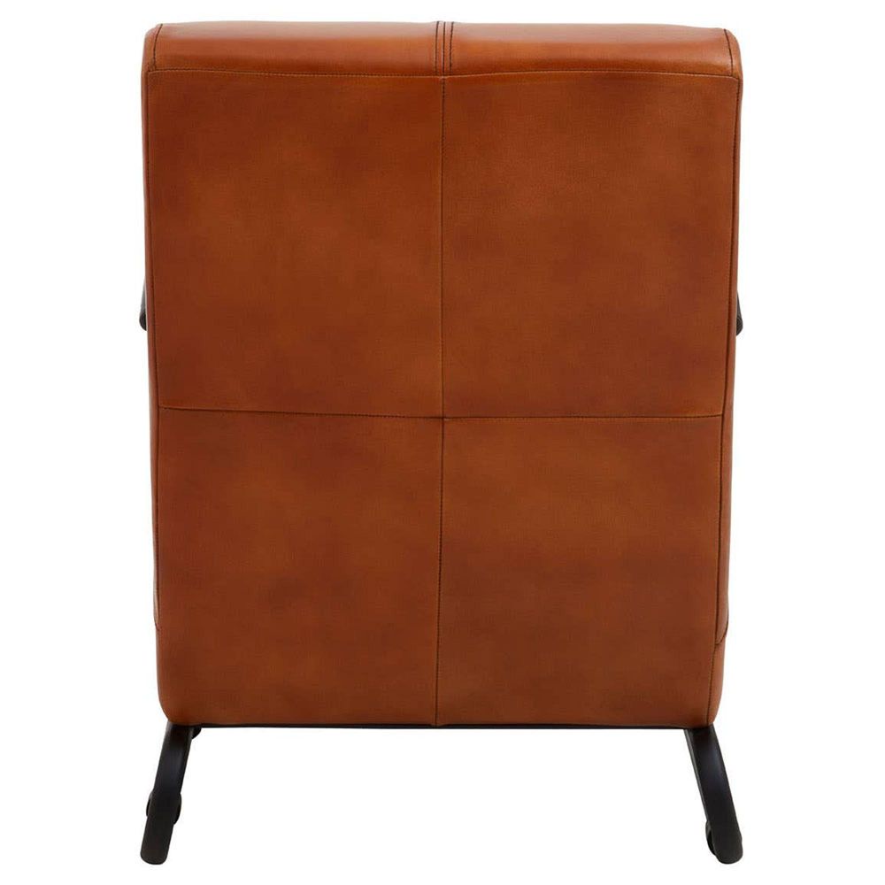 Item Code: 5529630 The Buffalo tan leather armchair has a sleek black iron frame and an ergonomically designed backrest. Upholstered in genuine tan leather, this armchair features vertical channel detailing on the padded seat and backrest. The sturdy black iron frame adds to the sleek aesthetic of this accent armchair.