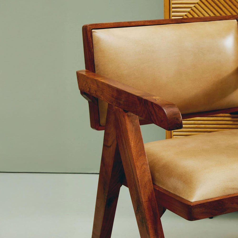 Item Code: 5529643 The Buffalo armchair has a sleek aesthetic with natural colour leather upholstery and an angular natural coloured wooden frame. This armchair has a comfortable padded seat and slanted back, upholstered in natural colour leather. The soft leather seat is supported by a strong angular natural coloured wooden frame which creates a modern aesthetic.
