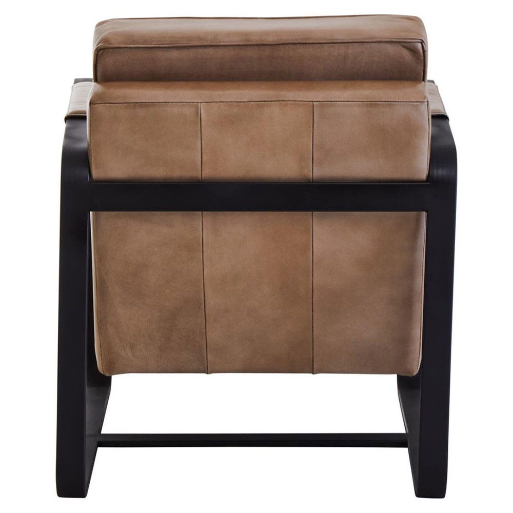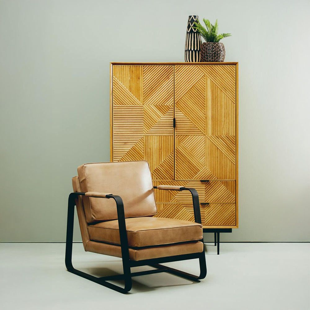 Item Code: 5529645 The Buffalo grey leather armchair creates a retro look with slim iron arms which extend to form the base in a curved silhouette. This armchair brings a modern touch with a deeply padded seat in genuine grey leather covering, supported with a comfortable matching cushion. The black finish iron frame with a curved aesthetic offers stability to the ergonomically designed back.