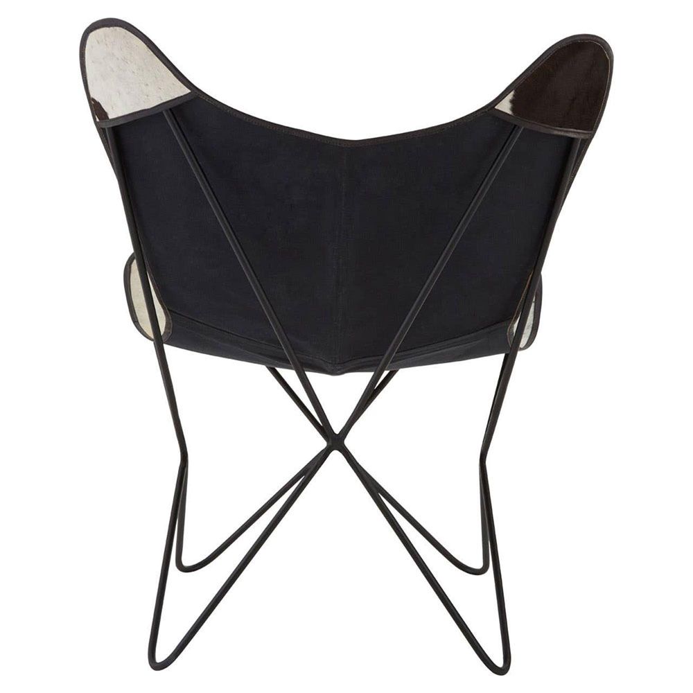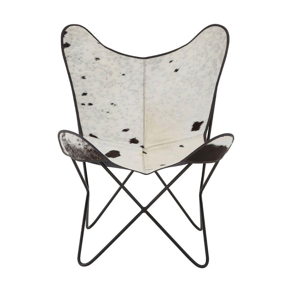 Item Code: 2405042 Slung with genuine black and white cowhide, the Buffalo butterfly chair is a luxurious seating solution for the home. The undulating outline of the black iron frame gives the Buffalo butterfly chair a flowing shape, while its black and white cowhide sling produces a monochrome look. Both combine to give this contemporary accent chair a relaxed aesthetic.