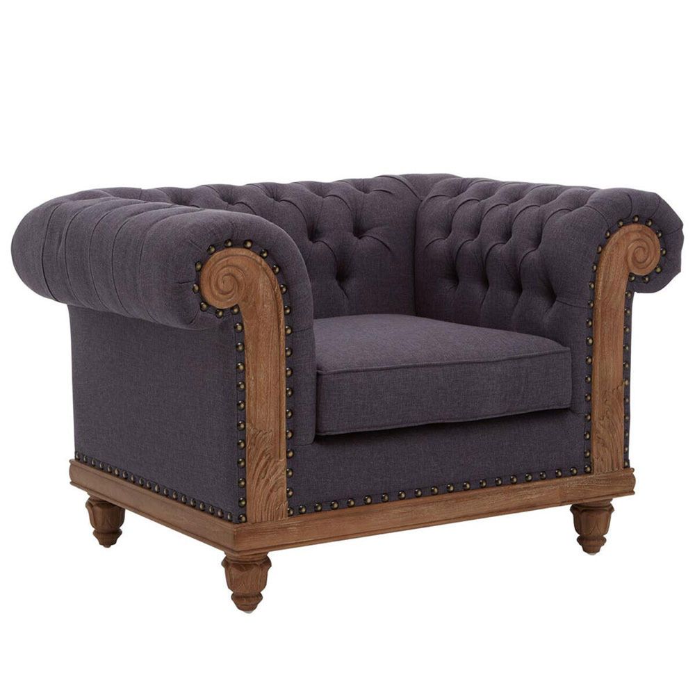 Item Code: 5527857 This Chesterfield chair in graphite grey fabric seamlessly combines a classic button-tufted design with sculpted wooden details, offering a refined and contemporary touch. The Cabra Chesterfield chair brings comfort and charm to any interior, featuring deep button-tufted upholstery, scrolled armrests, and stud detailing. The rich graphite grey colour adds a modern twist, while the carved wooden frame and legs introduce warmth and craftsmanship. Generously cushioned and perfectly proportioned, this armchair is ideal for creating a focal point in living rooms or formal sitting.