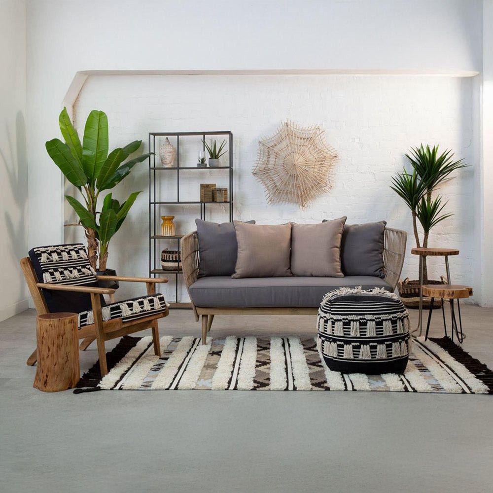 Item Code: 5527798 The Cefena black and white chair in a comfortable shaggy fabric is supported by a mango wood frame.This chair is a stylish and comfortable piece that blends natural materials with a touch of bohemian flair. The warm tones of the mango wood frame, combined with the textured woven fabric and tassels, create a relaxed and inviting aesthetic.