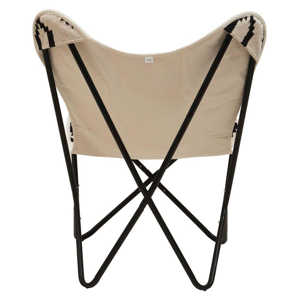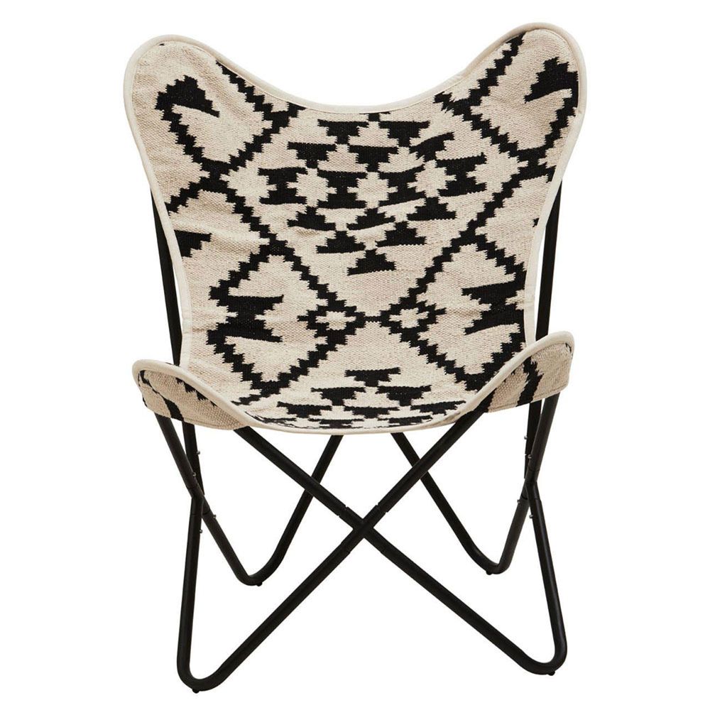 Item Code: 5529522 This chair will create an artful aesthetic in the living room or bedroom with the monochrome accent and hand woven geometric motifs.Expertly hand-woven from premium-quality cotton in black and white fibres, this chair offers an elegant and simple aesthetic to a range of transitional settings. This butterfly chair boasts a curving backrest, supported with a sleek black finish metal frame that adds style and stability.