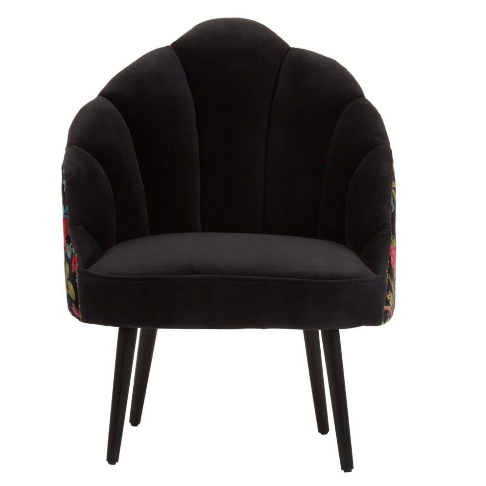 Item Code: 5529595 The Cafena armchair has a scalloped backrest, upholstered in black velvet, and features a vibrant peacock print, creating a sense of luxury and elegance.