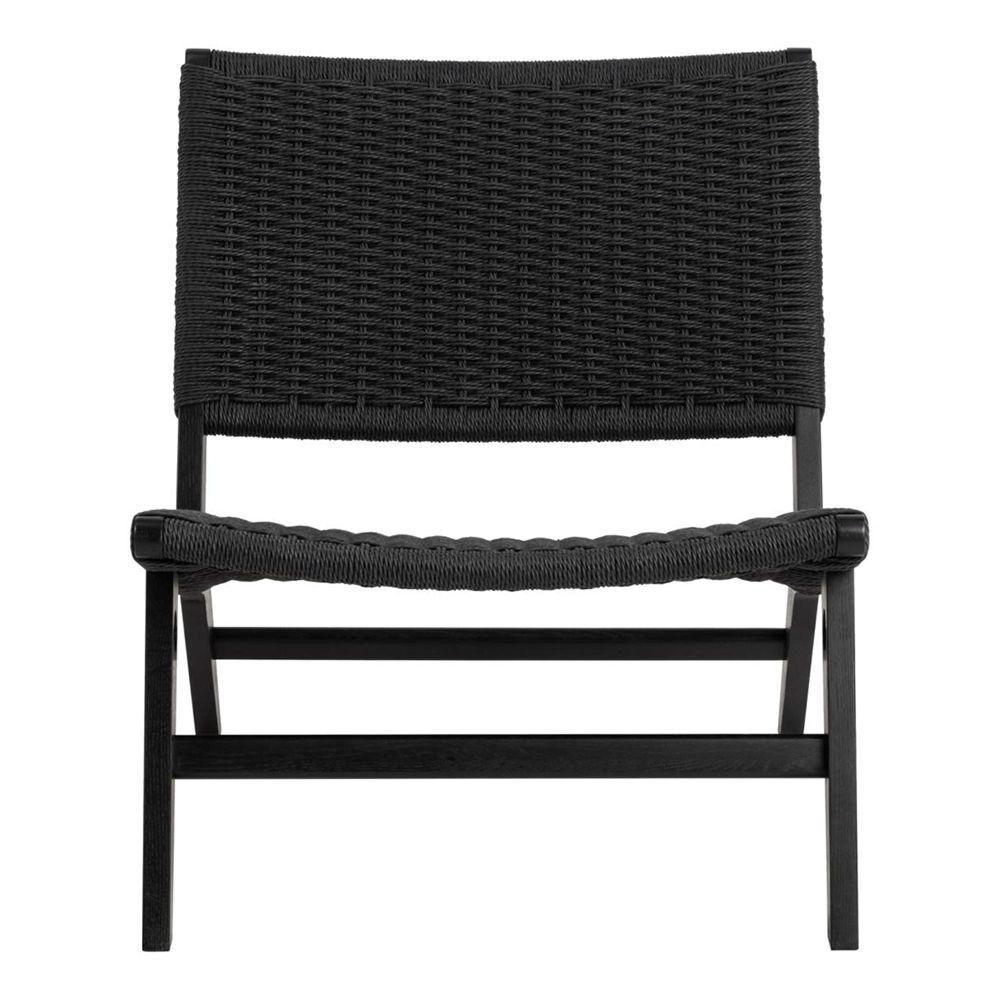 Item Code: 105206 Carson lounge chair, matt black paper plaits, base matt black NC lacquered oak with weaved pattern. Stylish, minimalistic, and Nordic three words encapsulating this lounge chair. Whether nestled in a corner or taking centre stage, it stands as a timeless piece, inviting moments of quiet contemplation. The black lacquered oak frame harmonizes with the paper plaits, intricately woven for a natural and tactile aesthetic.FSC certified.Free Delivery