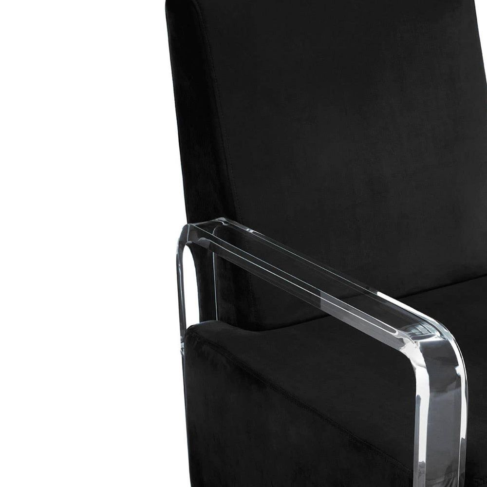 Item Code: 5501664 An on-trend addition for contemporary interiors, the Clarence chair has a chic black velvet opholstery and acrylic legs.Upholstered in rich black velvet fabric upholstery, the Clarence chair has a luxurious, tactile feel. The clear acrylic armrests extend down to the ground, acting as legs and lifting the chair. The minimalist design and squared, block shape of the backrest and seat give the chair a contemporary aesthetic.