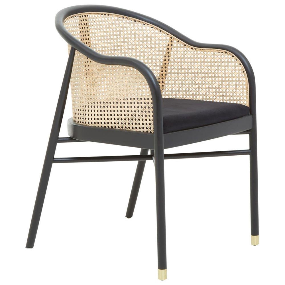 Item Code: 5527868 Eliciting minimal design, the Corso back chair will make an ideal seating solution in the living room.Handcrafted with the cane and completed with eco-friendly black rattan, this chair is complemented with a black velvet seat. Having ergonomic armrests, this chair is supported by slender legs finished off with gold finish tips.