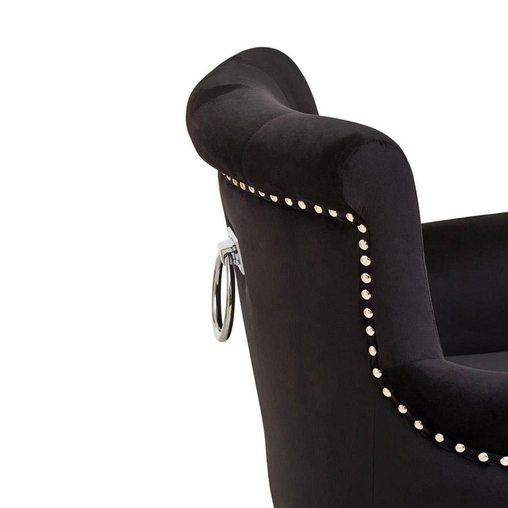 Item Code: 5528649 The Doucet black velvet chair with ring back and stud detail will suit chic interiors with boutique hotel style glamour.Covered in black velvet, this chair in foam padding has a buttoned back that lends it a decorative detail. Its scrolled armrests give it a traditional aesthetic while the black rubberwood legs with angled hindlegs add midcentury sophistication.