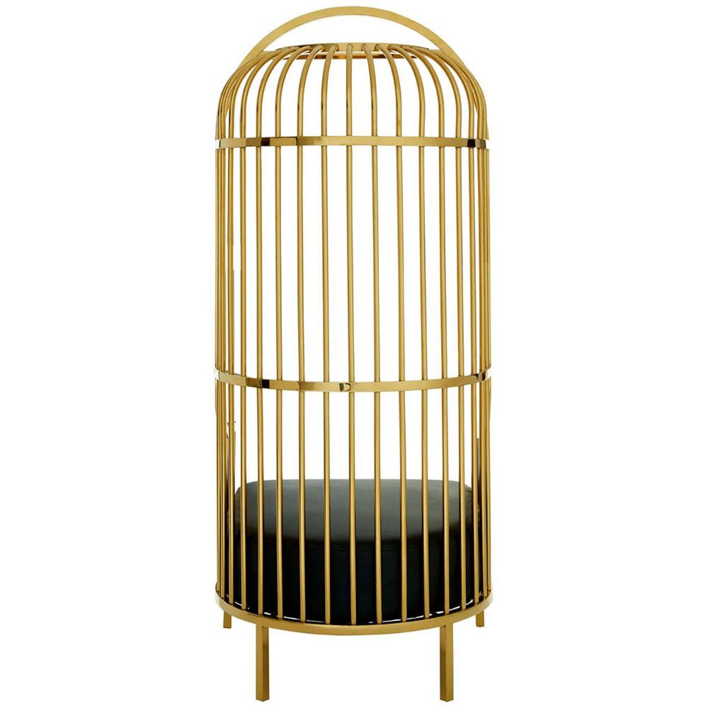Item Code: 5501962 An opulent statement piece, the Eliza chair is created from stainless steel and boasts a rich gold finish.Designed in a unique cage style, the chair features a grand back that extends upwards into a dome. Black faux leather upholsters the seat, creating a striking counterpoint to the chair's warm metallic frame.