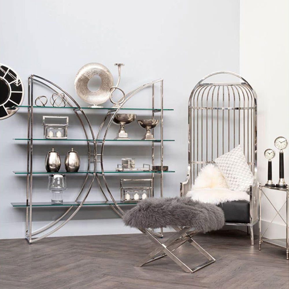 Item Code: 5501963 An opulent statement piece, the Eliza chair is created from stainless steel and boasts a cool silver finish.Designed in a unique cage style, the chair features a grand back that extends upwards into a dome. Black faux leather upholsters the seat, creating a striking counterpoint to the chair's cool metallic frame.