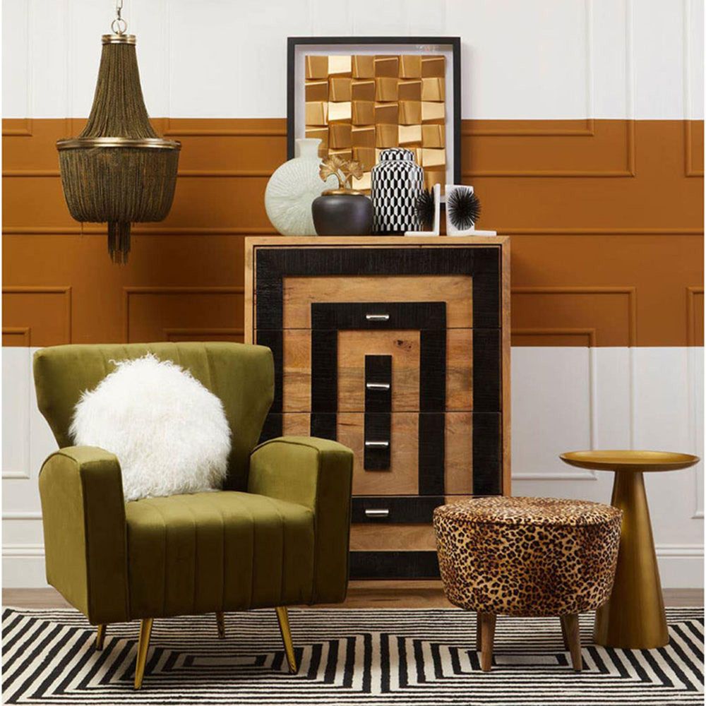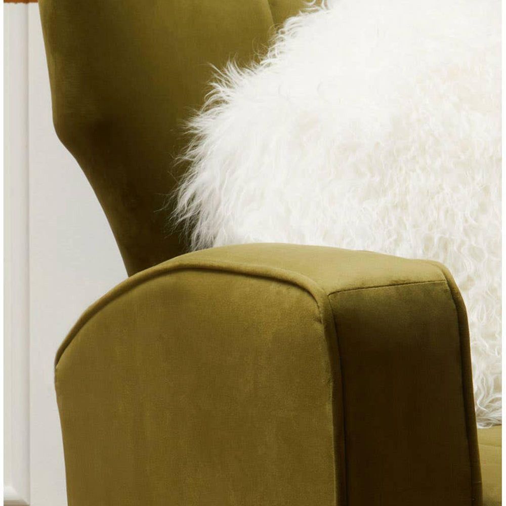 Item Code: 5528176 The Hayley armchair is a harmony of relaxation and style with plush green velvet upholstery and gold finish metal legs.This armchair has a modern retro style with a winged back and green velvet upholstery. The vertical channel tufting on the seat lends a decorative detail to it. The slanted legs enhance the visual appeal of the armchair.