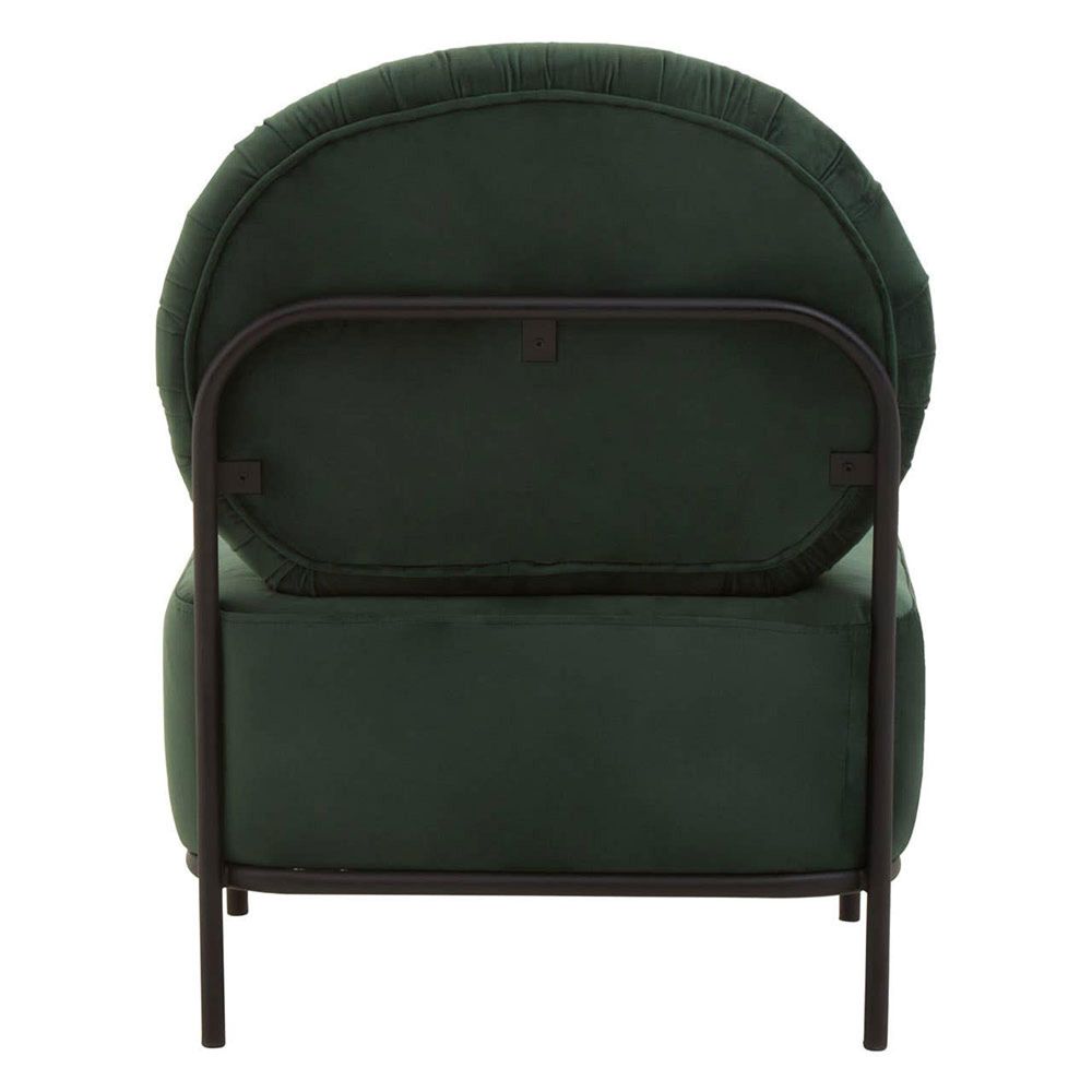 Item Code: 5528178 The Haya armchair is a harmony of relaxation and elegance with plush green velvet upholstery and black metal legs.This green velvet armchair blends retro and contemporary design with a round back and slender black metal legs. The smooth seat and slim legs give the chair a minimalist profile. The back is supported by a sturdy metal frame.