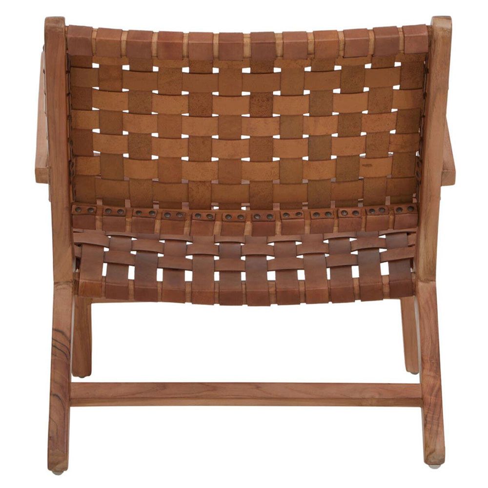 Item Code: 5527989 This statement chair introduces simplicity and comfort to boho and farmhouse-inspired homes.This chair is expertly handcrafted from genuine leather and exhibits a series of leather straps forming a lattice pattern weaving. The teak wood frame of this chair ensures stability, while the ergonomic arms offer an optimum seating experience.