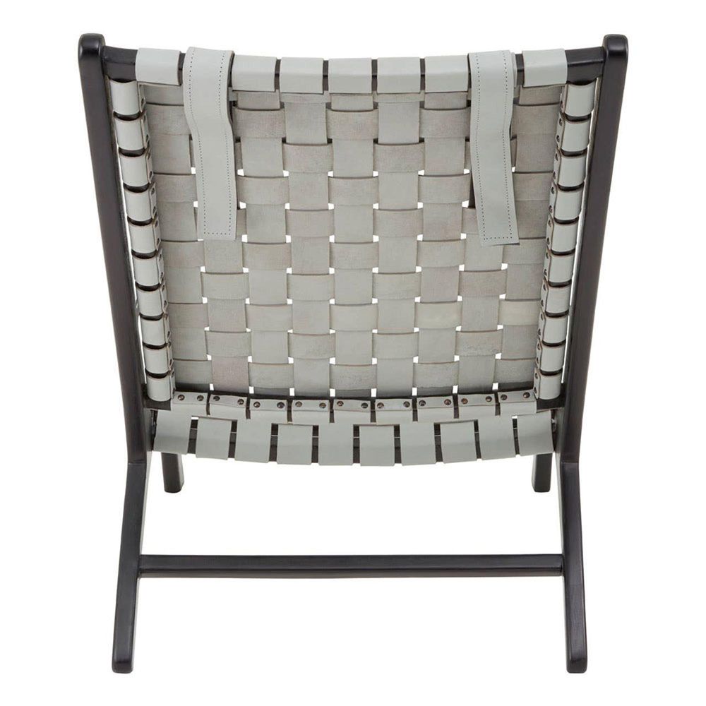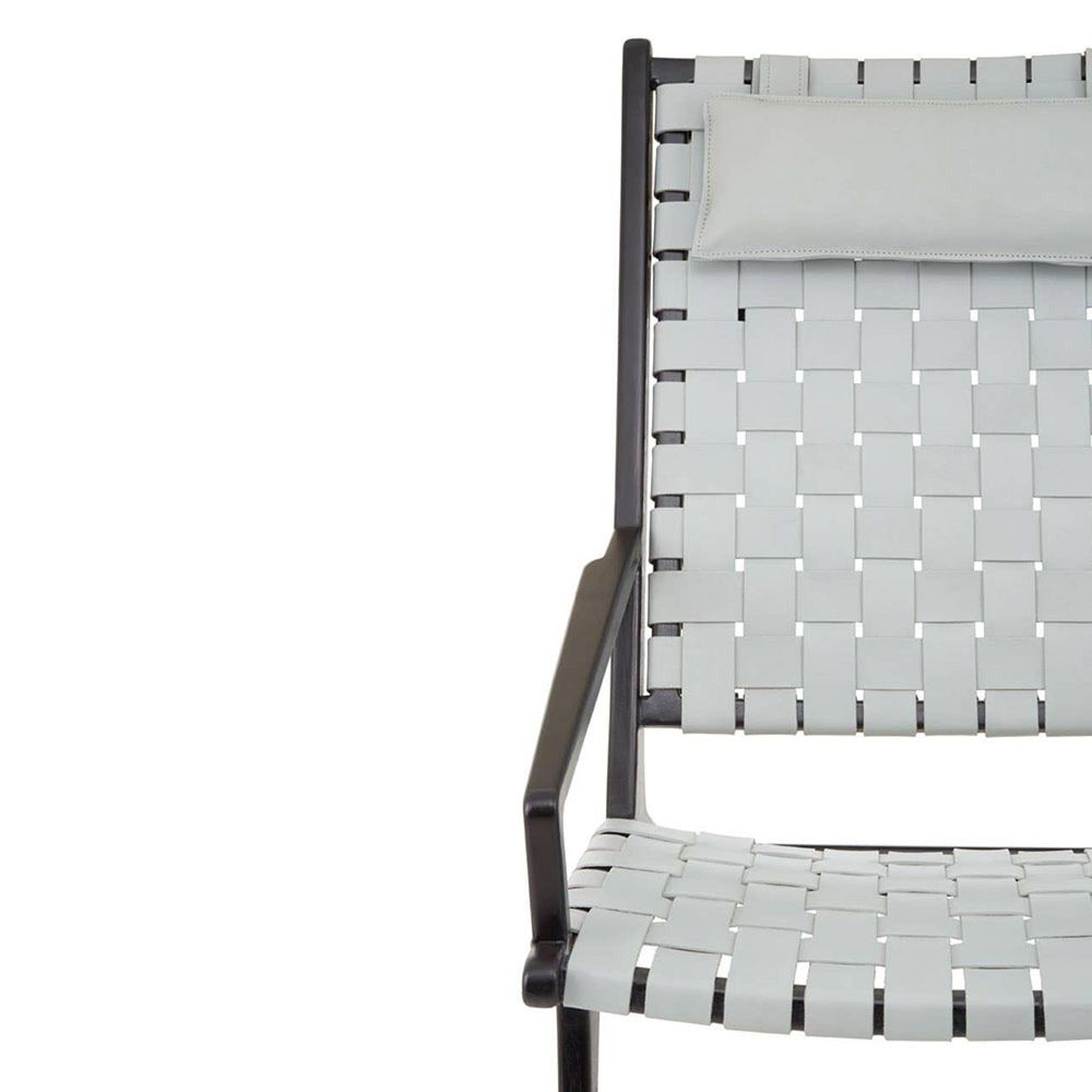 Item Code: 5527100 Kendari grey lattice woven detail leather lounge chair with cushion detail and black teak wood frame.Kendari grey leather lattice design lounge chair, the seat and tall backrest are upholstered with soft grey leather, woven into a distinctive lattice pattern that creates a supportive and comfortable sitting experience. A plump grey cushion is slung over the top to provide head support.