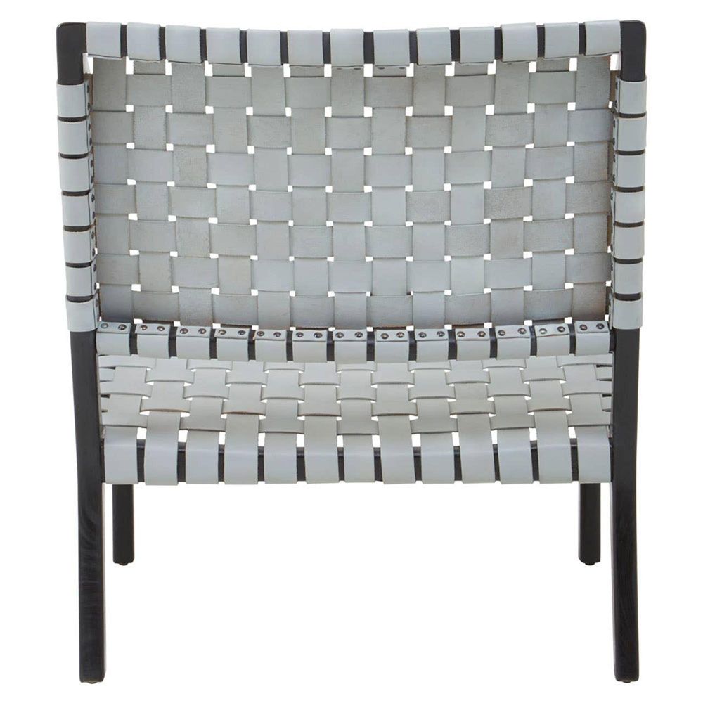 Item Code: 5527094 Kendari grey leather strap design lounge chair with black teak wood frame, this chair will complement any living space.The chair's frame is crafted from natural teak wood and has a black colour that creates a sleek finish. A series of soft leather straps are tautly strung across the seat and backrest, producing a lattice design that opens up the aesthetic and provides a comfortable sitting experience.