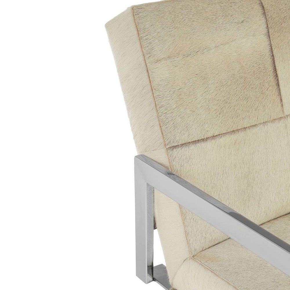 Item Code: 5501755 The Kensington Townhouse leather chair with stainless steel legs exhibiting textured aesthetics.The chair is upholstered with genuine leather covered with white hairs for a textured finish. Subtle stitching creates four square panels on the thick padded seat and backrest. The backrest has a reclined design giving the chair a relaxed aesthetic.