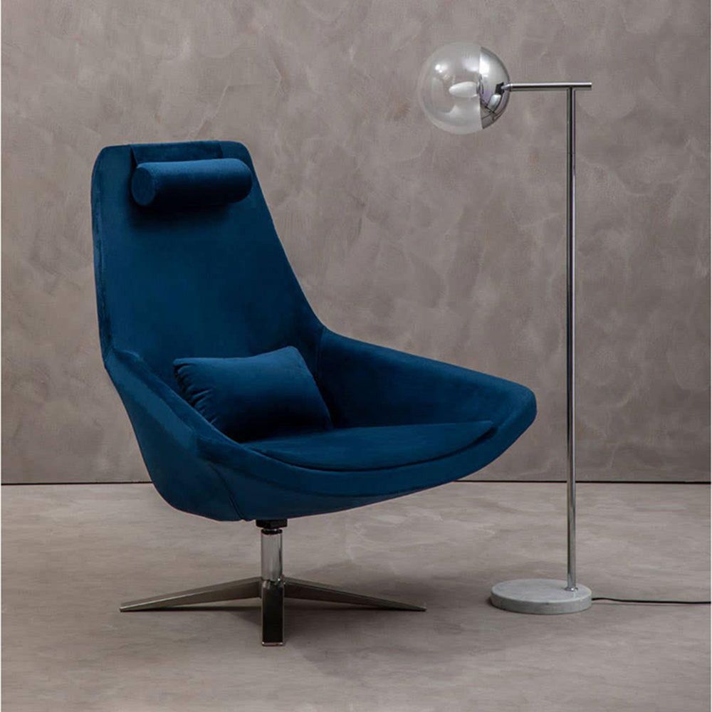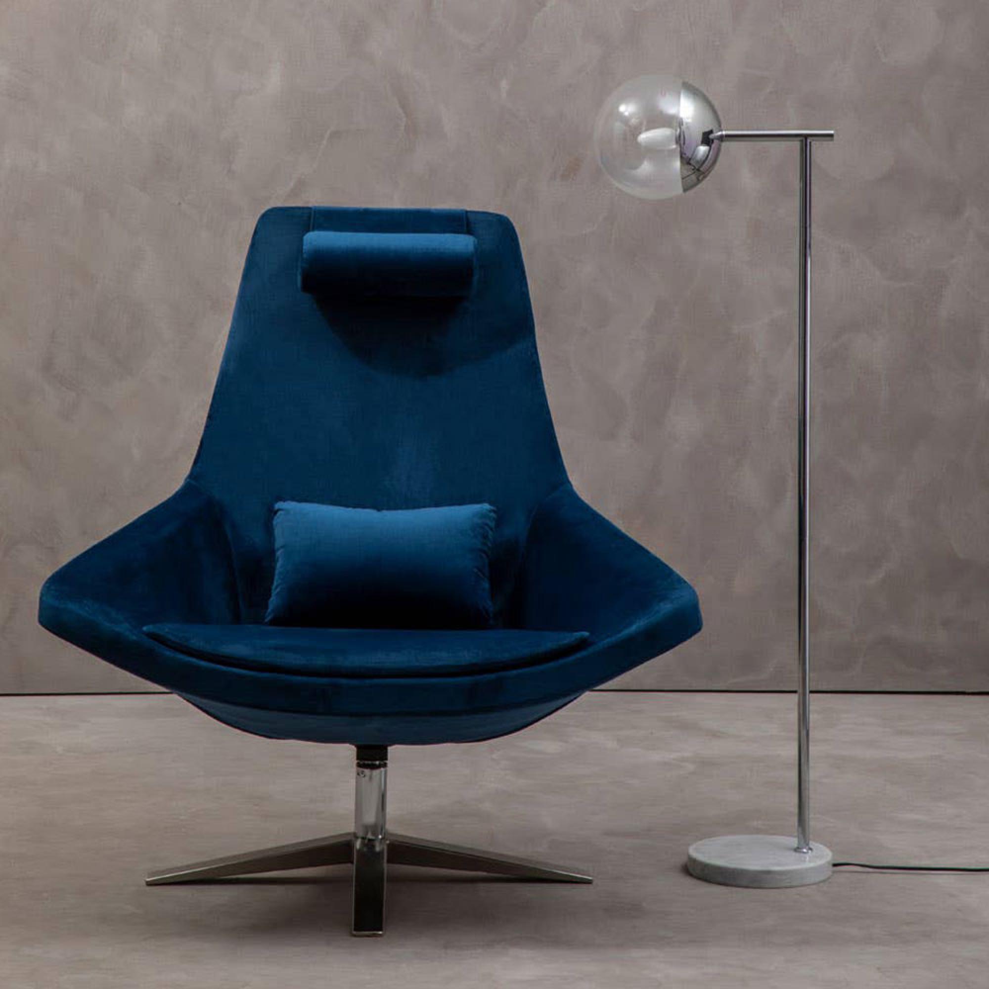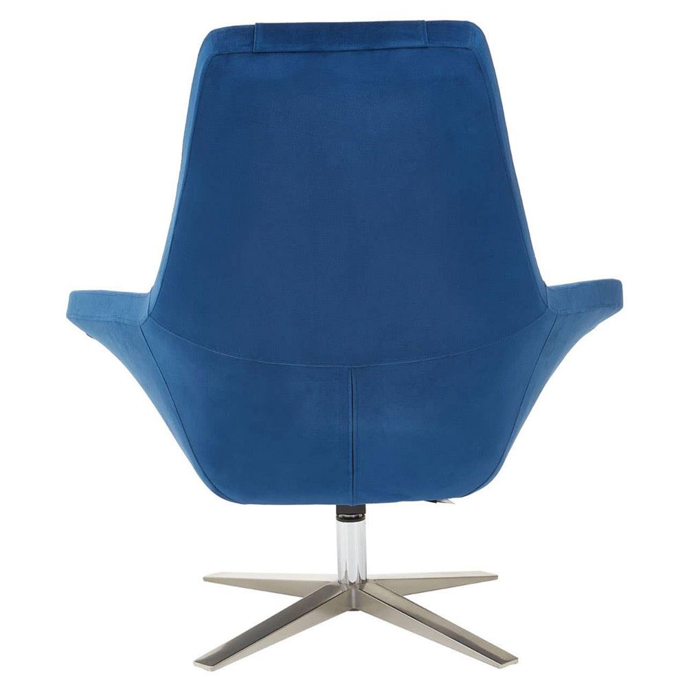 Item Code: 5528234 This mid-century accent chair with a curved back complements the contemporary aaesthetics of the living area.This midnight navy velvet armchair features foam padding and a star base in silver finish. This chair has additional backrest cushion and a neck support to ensure comfortable seating experience.
