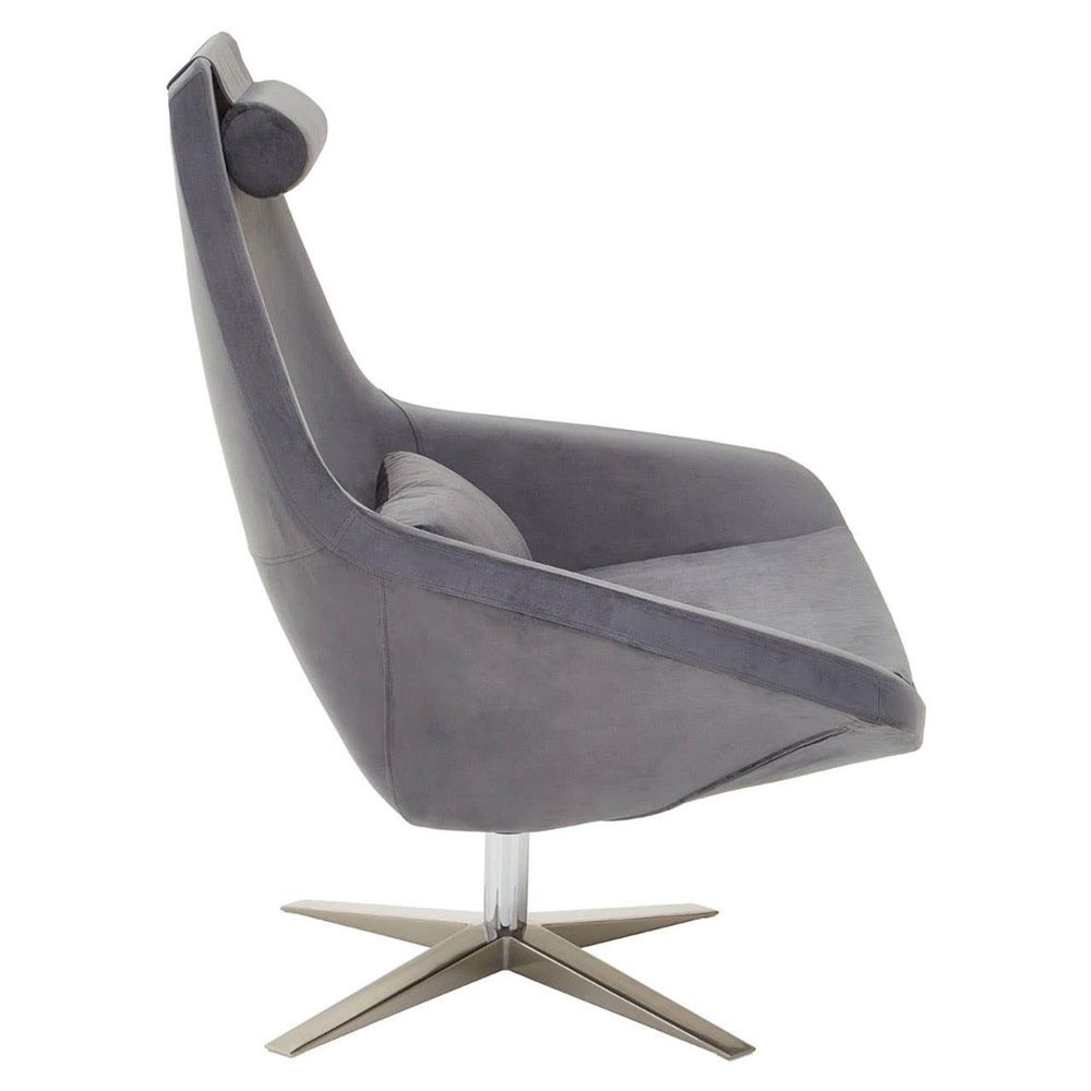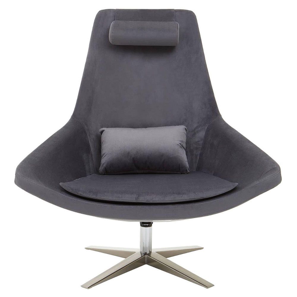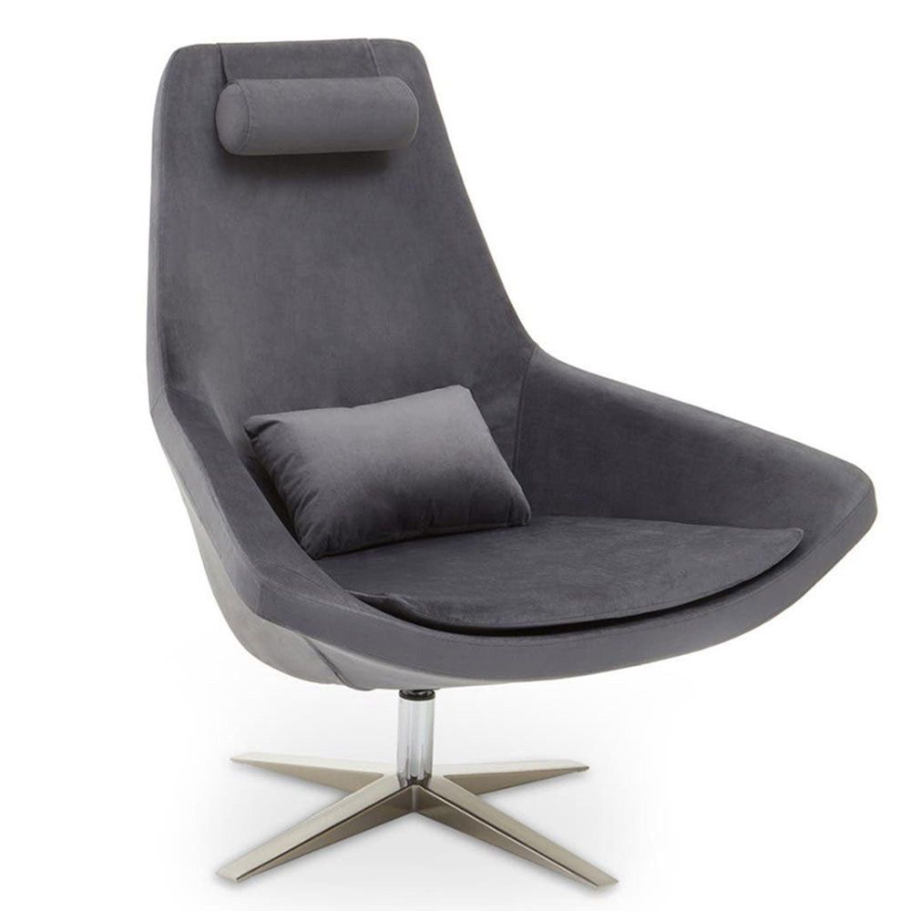 Item Code: 5528235 This mid-century accent chair with a curved back complements the contemporary aaesthetics of the living area.This grey velvet armchair features foam padding and a star base in silver metallic finish. This chair has additional backrest cushion and a neck support to ensure comfortable seating experience.