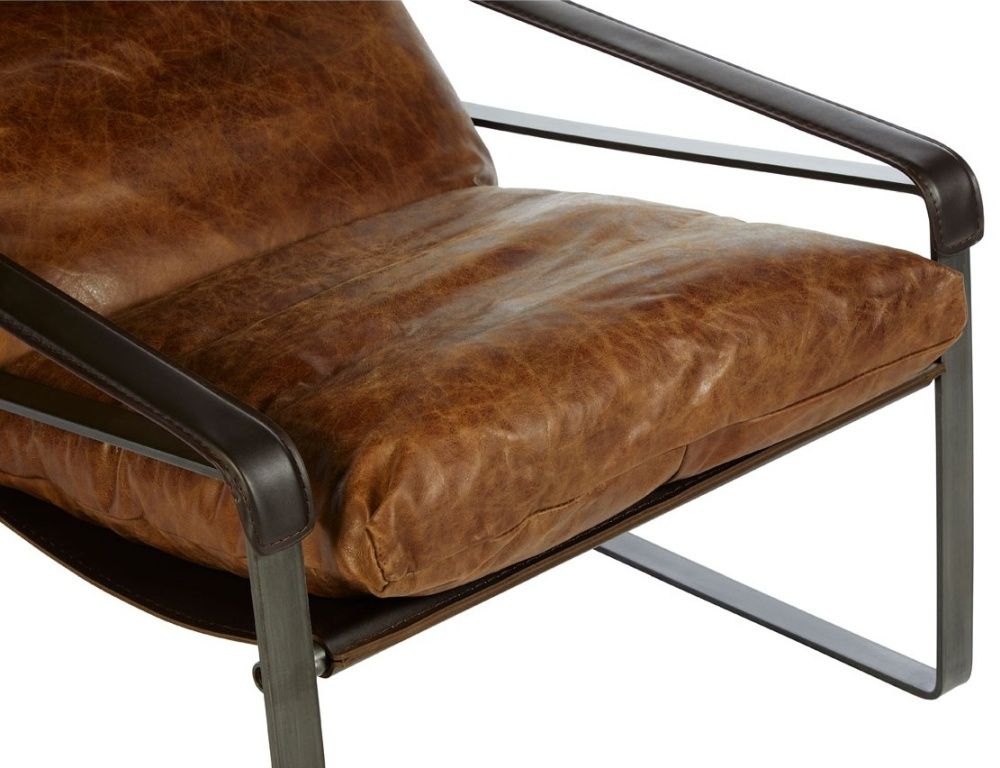 Item Code: 5502204 The Hoxton lounge chair's flat, angular legs are crafted from sturdy iron, with subtle distressing enhancing its industrial appeal.Genuine brown leather trims adorn the Hoxton lounge chair's armrests and back, with striking lighter stitching adding a tonal contrast. The soft cushioned backrest and seat are also upholstered in genuine leather, its prominent distressing enhancing the factory-floor aesthetic. Coordinate with natural wood and cool metallic accents.