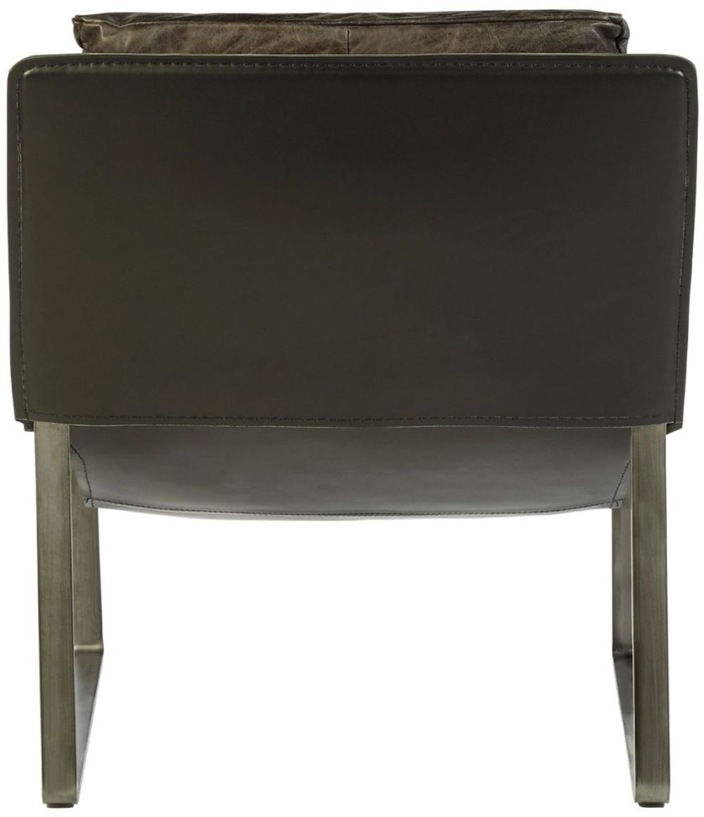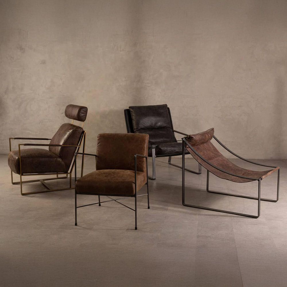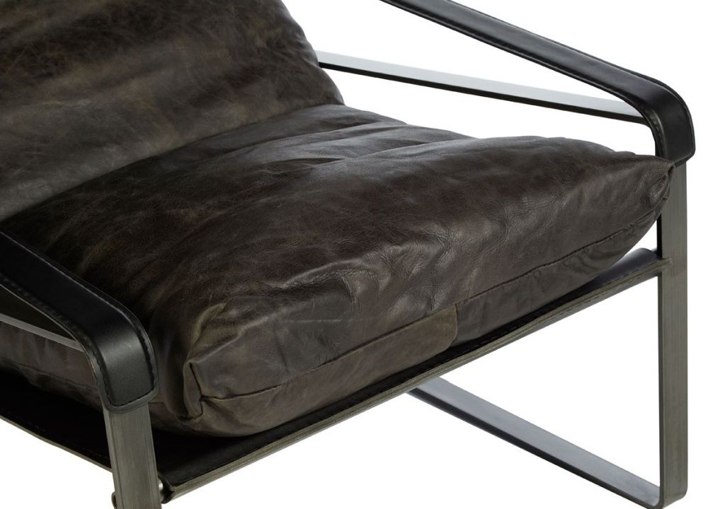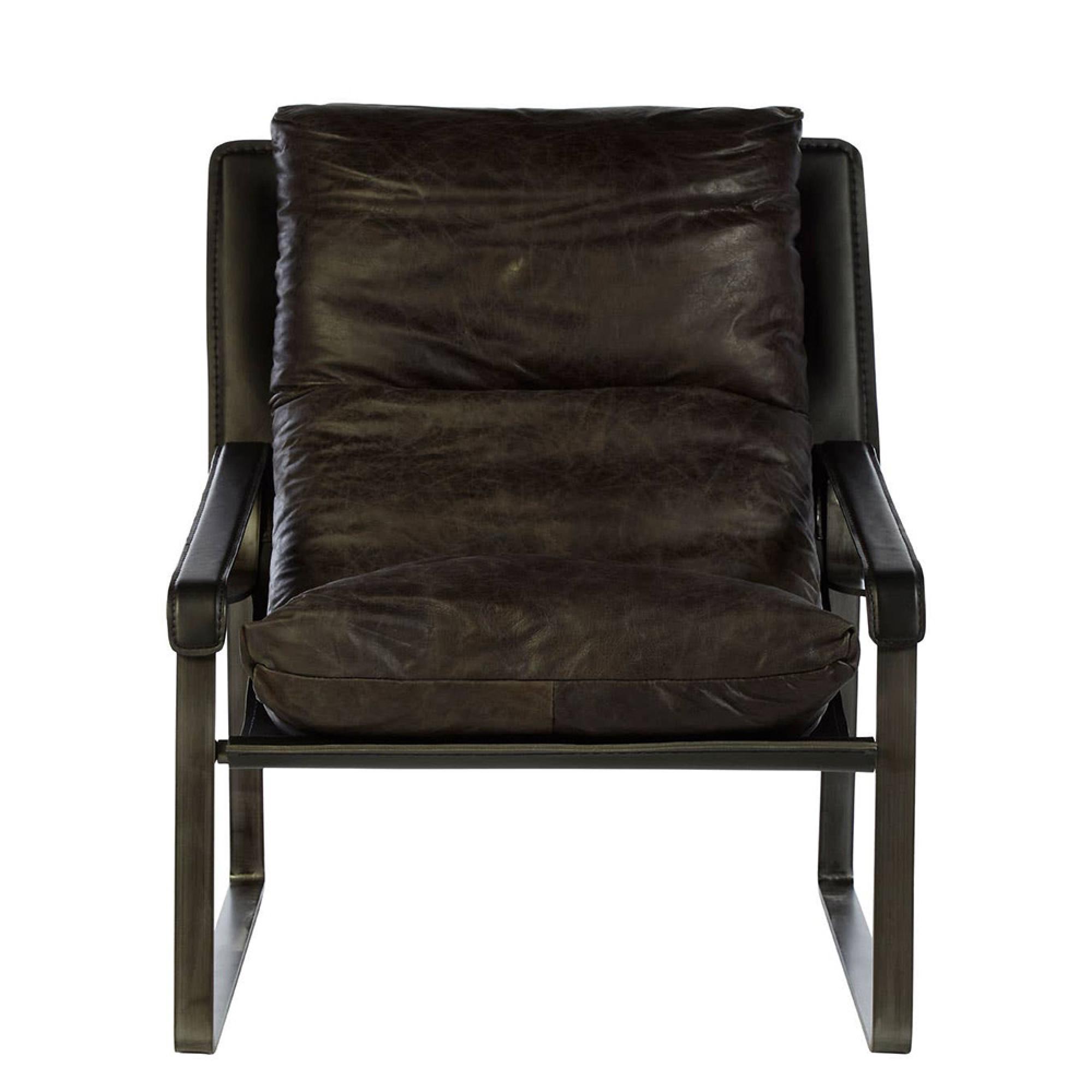 Item Code: 5502203 The Hoxton lounge chair's flat, angular legs are crafted from sturdy iron, with subtle distressing enhancing its industrial appeal.Genuine dark brown leather trims adorn the Hoxton lounge chair's armrests and back, with matching leather upholstering the soft cushioned backrest and seat. Prominent distressing on the seat enhances its factory floor aesthetic. This chair's colourings lend it to monochromatic interiors.