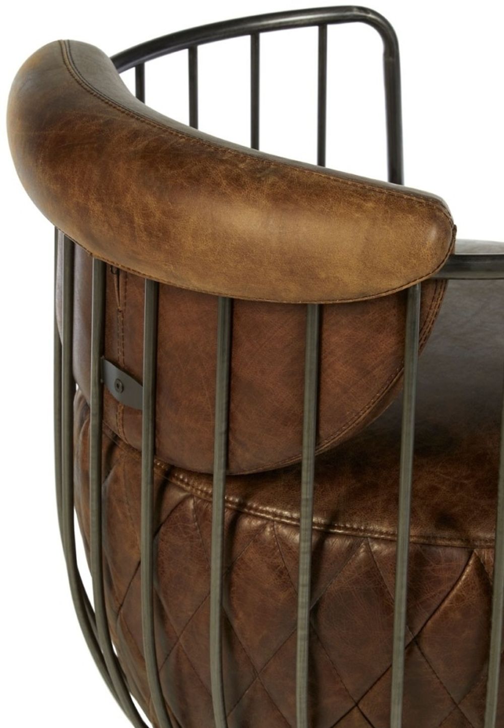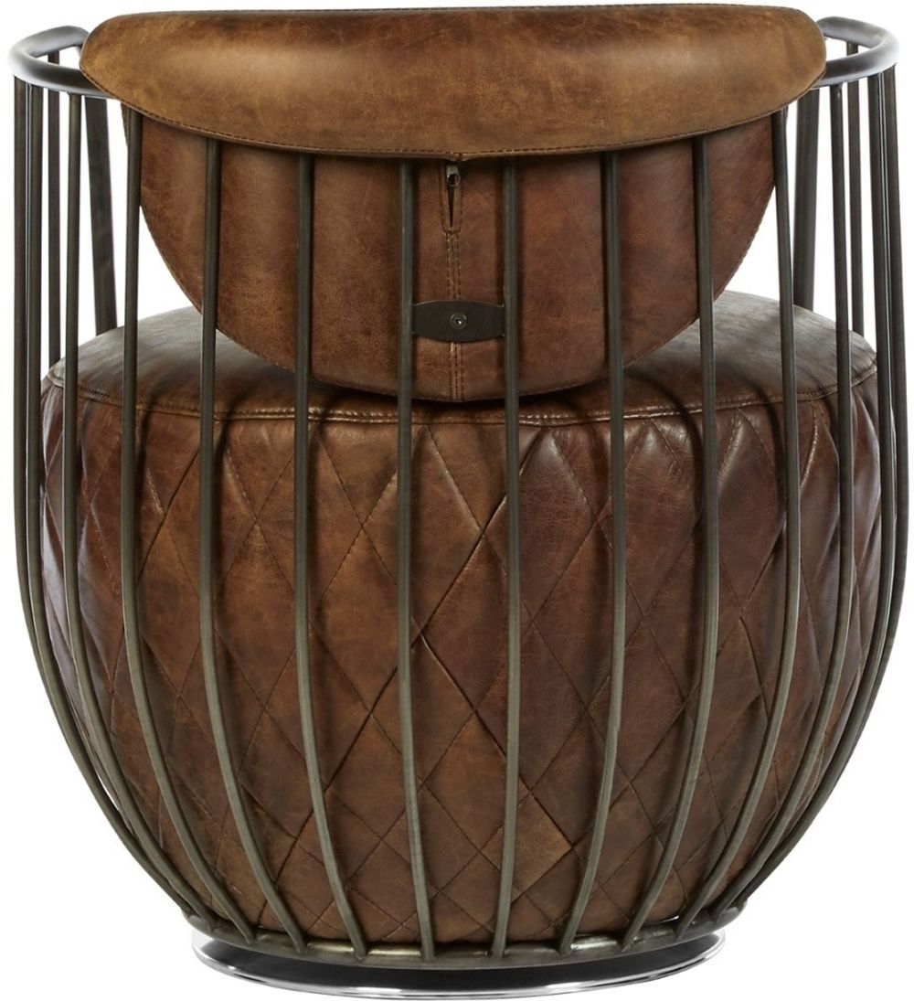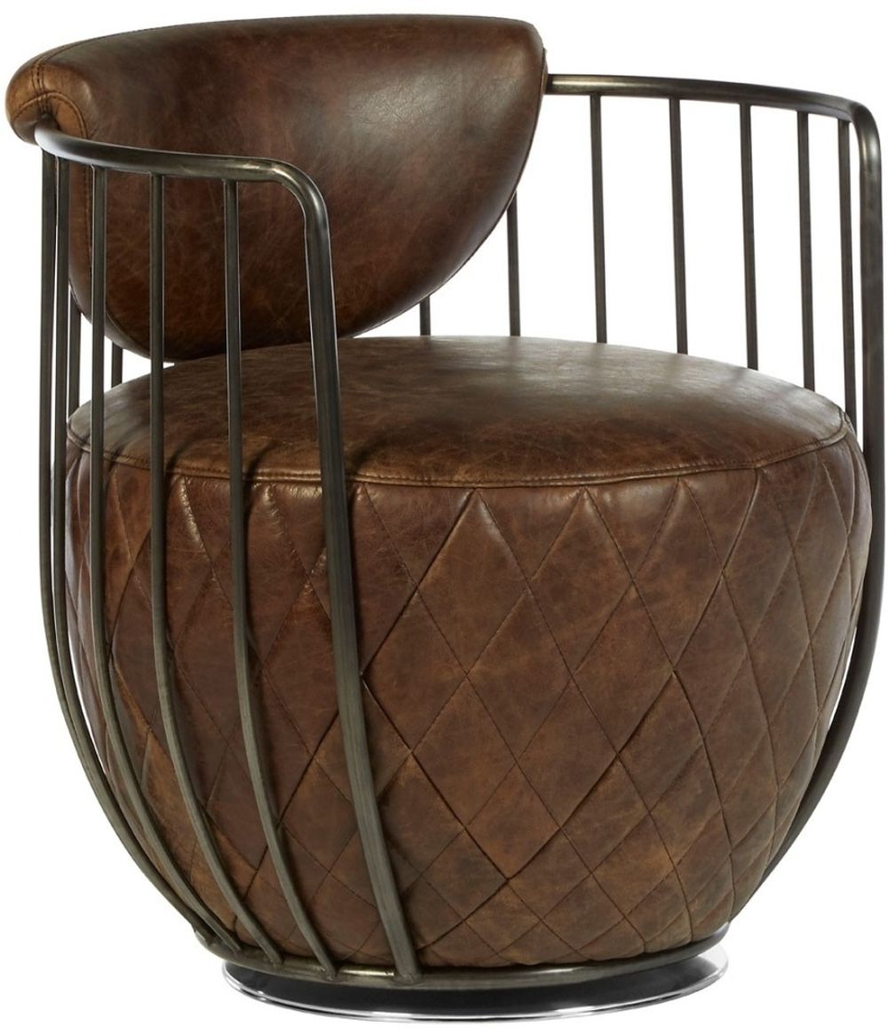 Item Code: 5502322 The slender frame of the Hoxton chair is formed from robust iron that creates its distinctive barrel shape.The base of the frame sits on a reflective iron disk that allows the chair to rotate and swivel. The seat and semicircle shaped backrest are upholstered in distressed genuine brown leather, adding a natural juxtaposition to the metallic frame. Shallow quilted detailing lends a decorative and textured touch to the seat.