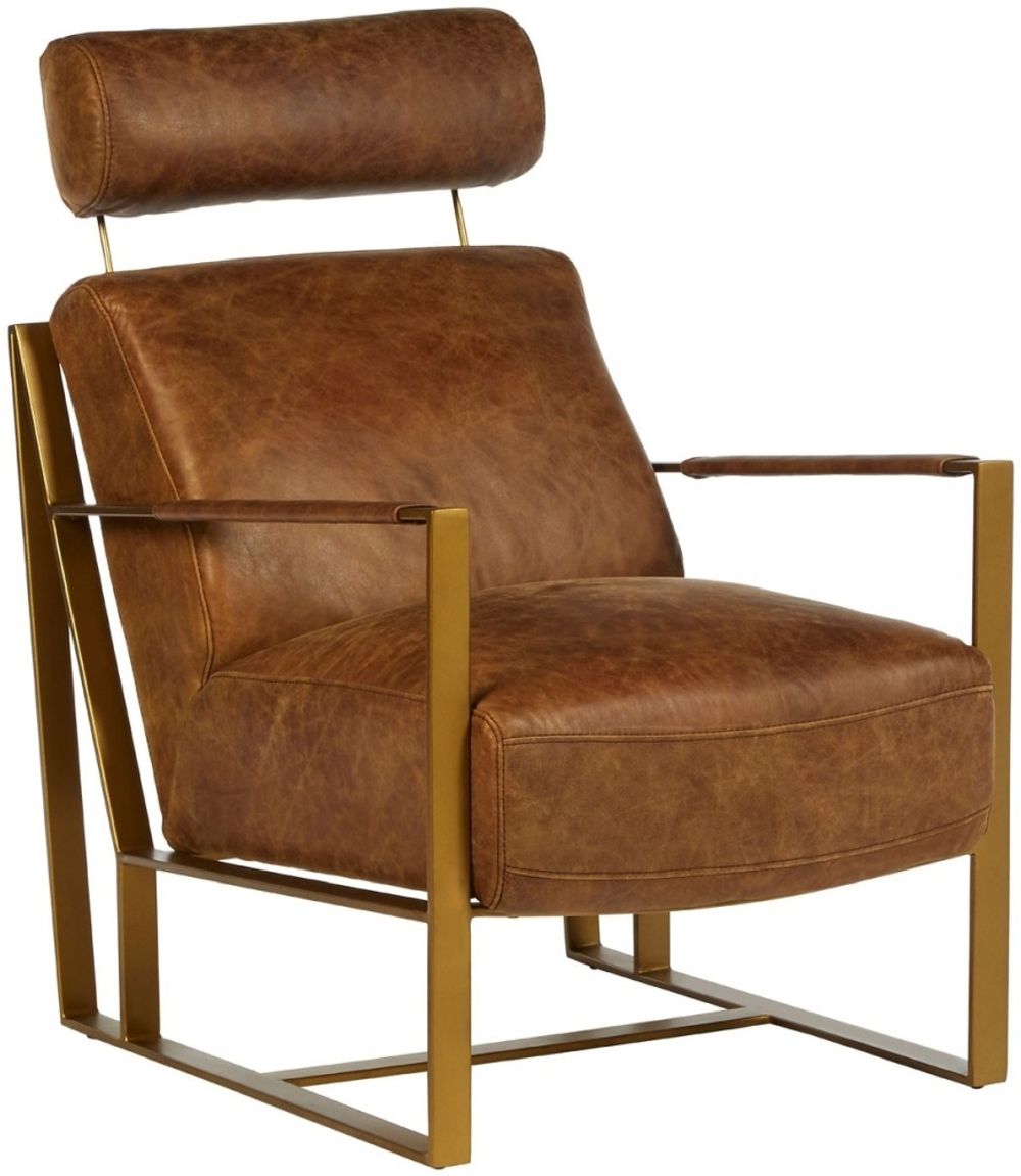 Item Code: 5502213 A genuine leather headrest adds a comfortable accent to the industrial style Hoxton lounge chair.The Hoxton lounge chair's flat, angular legs are crafted from sturdy iron, with a rich gold finish lending a luxe edge. The chair's seat and backrest are made from plump, stuffed cushions upholstered in genuine light brown leather. Prominent distressing on the leather lends a natural juxtaposition to the warm metallic frame.